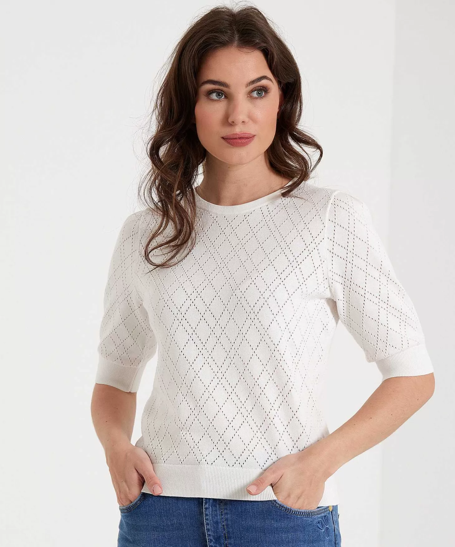 Dit Truitje In Ajour Is Wel Een Hele Fraaie. Zie Je Haar Verfijnde Knit Met Wiebertjespatroon En Voel Je Haar Zachte Katoen? In Blauw, Oranje En Wit En Met Een Aansluitende Fit Past Ze Perfect In Jouw Garderobe. Nu Al Onder Een Blazer, Met Pantalon En Laarsjes Op Kantoor Of Een Party En Straks Met Een Jeans En Sneakers Op Citytrip. Maar Ook Met Een Printbroek Of Maxi-Rok + Laarsjes Maak Je Een Sprankelende Entree. Dit Is Met Recht Een Fashionable Doordrager, Mark My Knitted Words! Samenstelling: 100% Katoen.