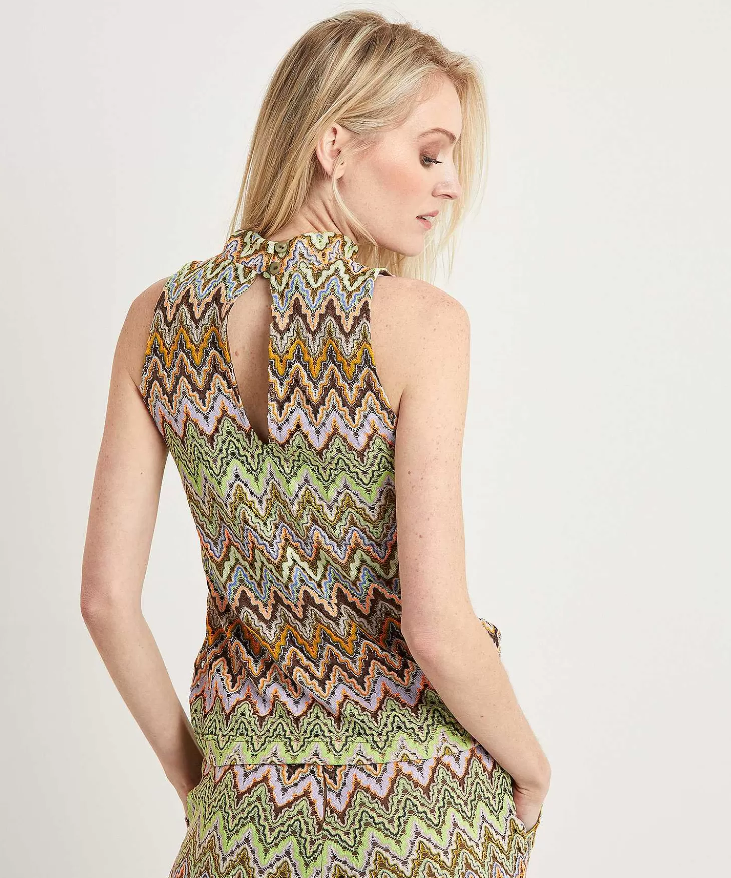 Ragfijn En Transparant Opengewerkt Is Deze Sierlijk Gebreide Top Van Ana Alcazar. In Een Zigzagpatroon In Frisse En Warme Tinten Als Camel, Groen En Blauw En Met Een Sprankelende Toevoeging Van Een Glimmend Lurex Draadje. Met Deze Top Kom Je Zeker Binnen. De Top Is Mouwloos, Heeft Een Opstaand Kraagje En Is Gevoerd Met Een Soepel Licht Glanzende Bruine Polyester. Draag De Top Op Je Aangesloten Jeans Of Wide Leg Pants. Of Durf Te Combineren Met Broek Posyda In Hetzelfde Breisel. De Top Sluit In De Nek Met Twee Knoopjes. Samenstelling: 100% Polyester. Ondertop: 95% Polyester, 5% Elastan.