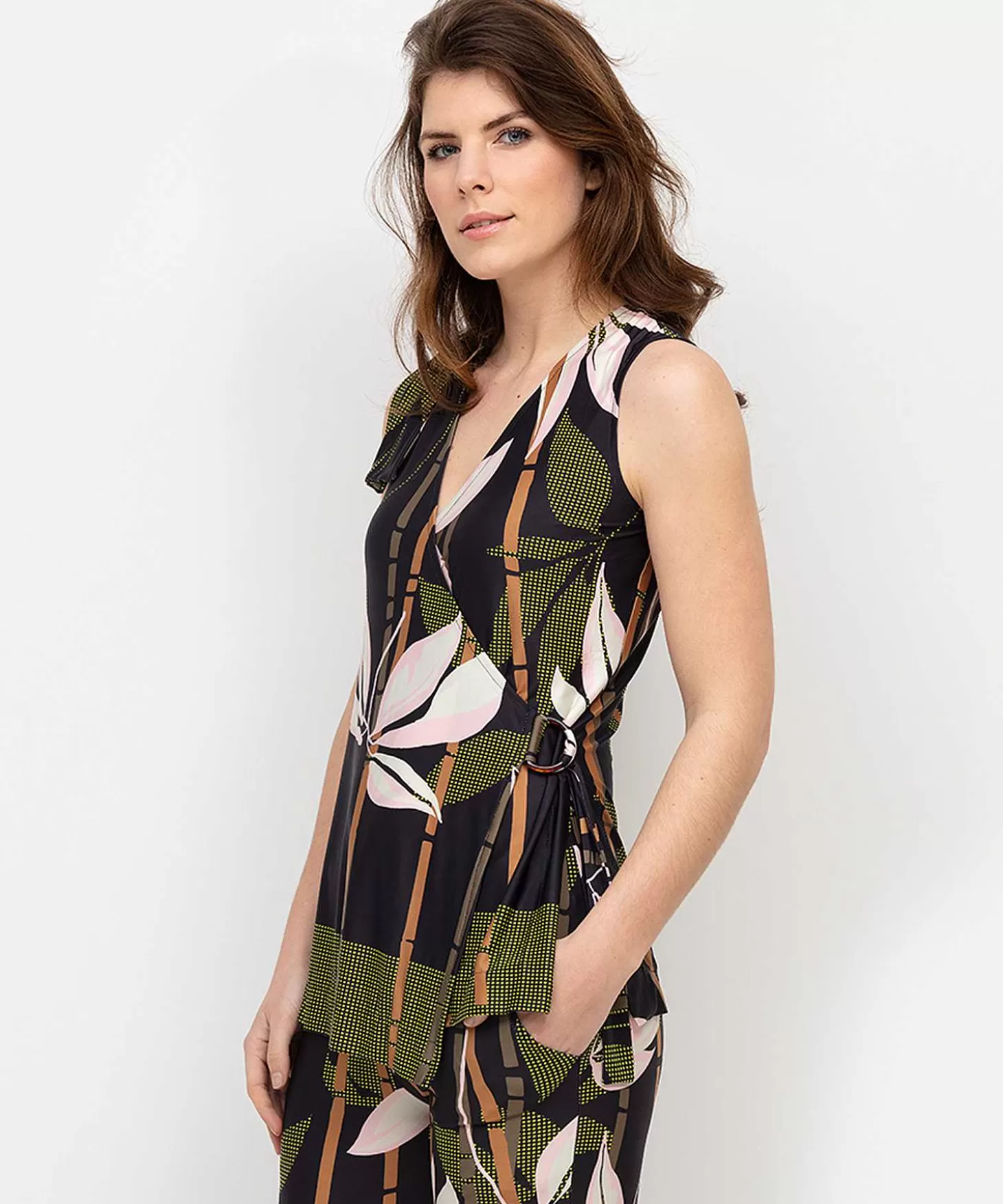 Sierlijke Overslagtop Uit De Collectie Van Ana Alcazar (Model Cegyl) In Een Zeer Soepele Stof Met Grote Bloemen In De Tinten Zachtroze, Offwhite, Camel, Lime En Groen Op Een Zwarte Ondergrond. Het Model Heeft Aan De Voorzijde Een V-Hals En Een Overslag Die Gesloten Wordt Met Een Ronde Vintage Gesp. In De Zijnaden Twee Hoge Splitten. Prachtig Op Een Pantalon In Zwart Of Offwhite En Een Mooie Blazer. Lengte Vanaf De Schouder Bij Maat 38: 69 Cm. Samenstelling: 95% Viscose, 5% Elastan| Voering: 94% Polyester, 6% Elastan.