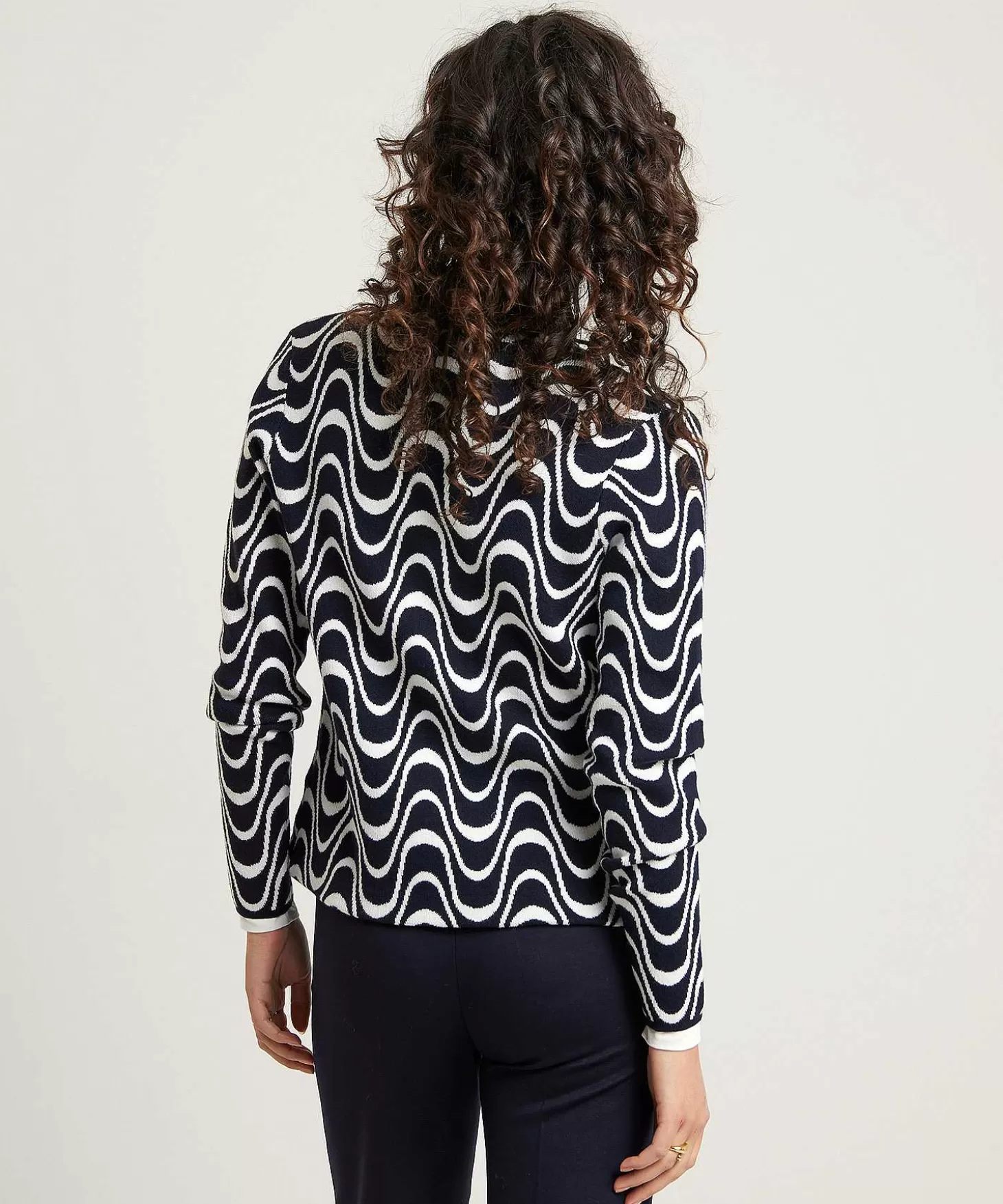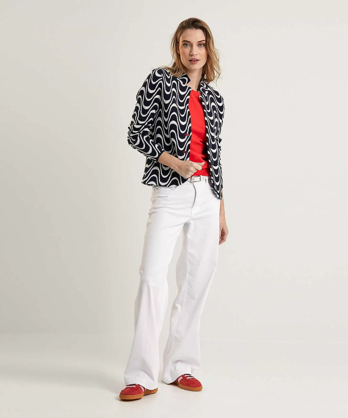 Het Blazervest Is Een Absolute Musthave En Deze Van Is Wel Een Hele Fraaie. Voel Je Haar Zachte Breisel In Katoenmix En Tel Je Haar Golfjes In Wit Op Marine? Naast Haar Sprekende Wavepatroon Is Ze Minimal Chic Met Haar Opstaande Reverskraagje En Praktische Zakjes. Je Draagt Dit Vestje In Blazermodel Met Een Crispy Witte Blouse, Een Pantalon En Loafers Naar Je Werk. Tijdens Een Middagje Shoppen Combineer Je Haar Met Een Uni Poloshirt Of Colpulli En Een Jeans + Laarsjes En Wat Dacht Je Van Naar Een Feestje Met Een Mesh Shirt, Een Vegan Leren Broek En High Heels? Samenstelling: 80% Katoen, 17% Polyamide, 3% Elastan.