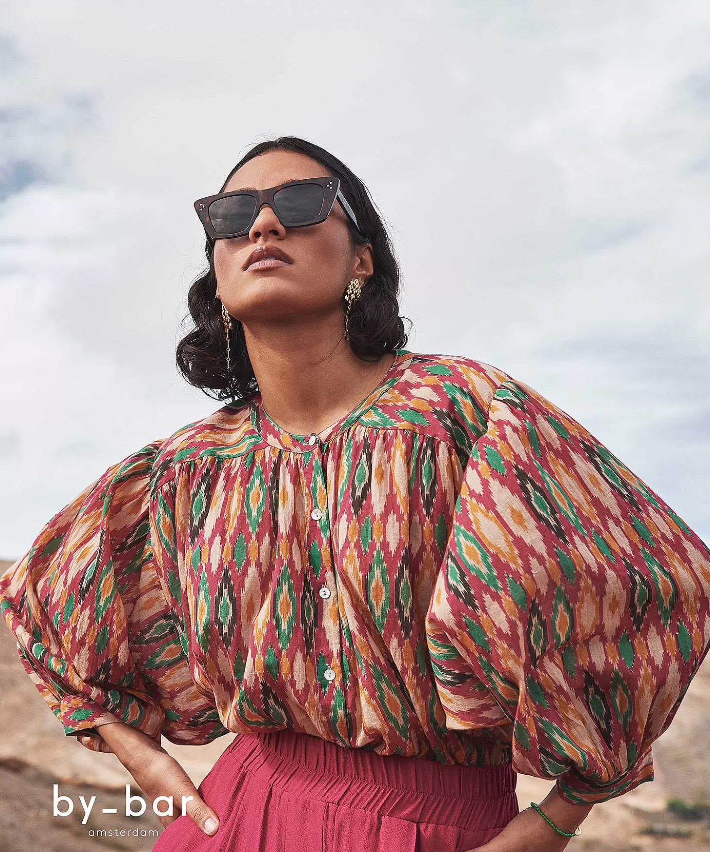 Blouse Lucy Uit De Collectie Van By-Bar Is Uitgevoerd In Een Kleurrijke Ikat Print Op Een Lichte Zomerse Katoen. Eindeloos Variëren Doe Je Met Deze Blouse Die Een Rechte Ruimvallende Pasvorm Heeft En Wijde Pofmouwen. Draag Haar Bijvoorbeeld Losjes Over Je Flared Jeans, Zodat Je Ziet Dat De Achterkant Iets Langer Is Dan De Voorkant. Of Kies Er Juist Voor Om De Blouse In Je Rok Of Broek Te Dragen Waardoor Een Geweldig Poffend Effect Ontstaat Samen Met De Ballonmouwen. De Blouse Sluit Met Fijne Parelmoerkleurige Knoopjes En Heeft Een Ronde Hals. Kies Voor Een Sandaaltje Met Hak In De Kleuren Fuchsia Of Groen Of Houd Het Rustig Met Een Zandkleurige Hak. Samenstelling: 100% Katoen.