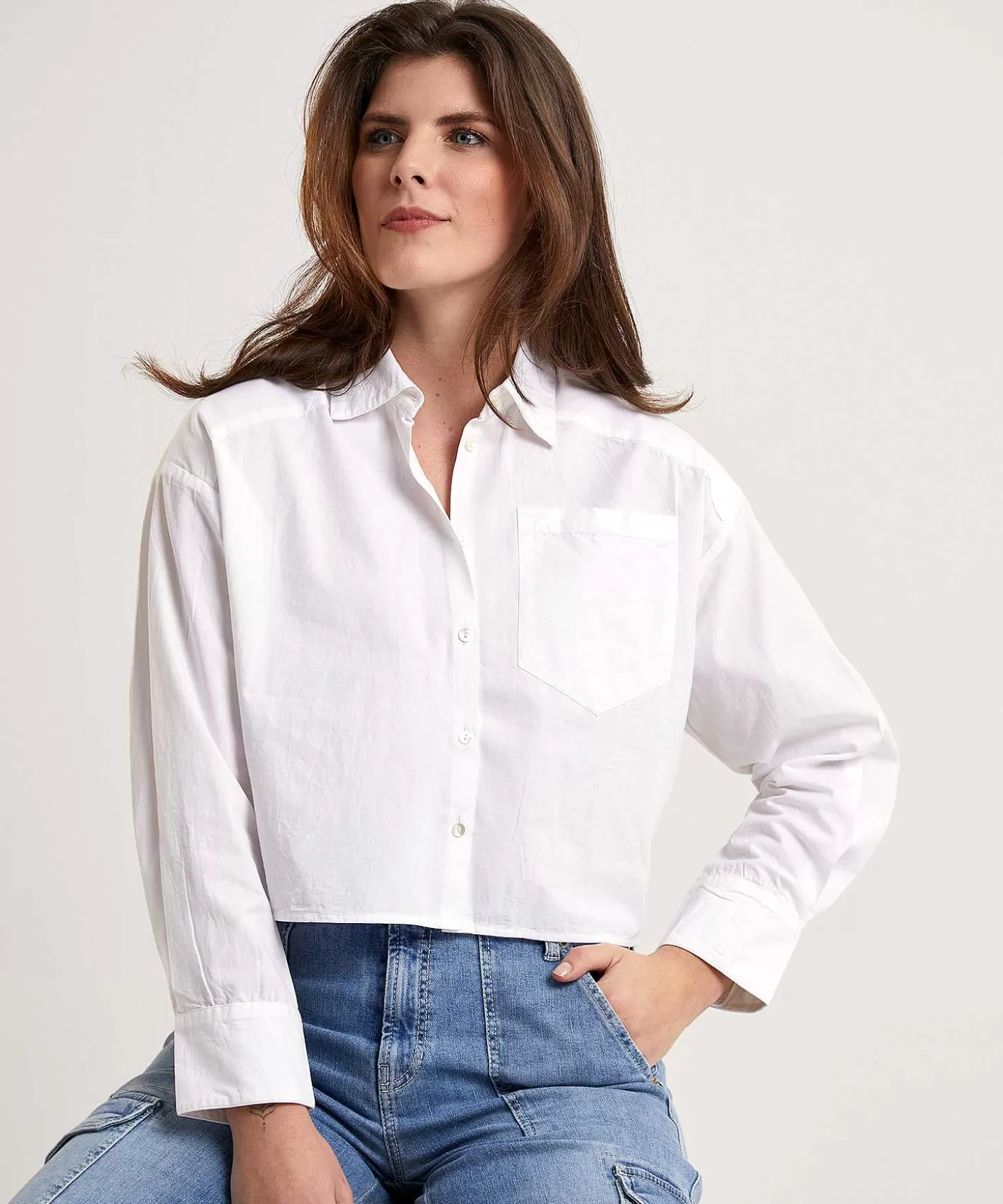 In Fijne Poplin Is Deze Korte By-Bar Blouse Klassiek En Sportief Tegelijk. Zie Je Haar Korte Fit Met Rond Langer Achterpand, De Borstzak En De Laag Ingezette Mouw En Pas Met Platte Plooi Achter? Je Draagt Florien Met Een High-Waist Jeans Of Wide Leg Broek, Maar Ook Een Denim Rok Kan Ze Aan. Sneakers, Loafers Of Laarsjes Eronder En Je Bent Overal Op Je Best Gekleed. Wie Zegt Dat Een Witte Blouse Niet Comfortabel Is? Casual Fit, Rechte Pasvorm. Samenstelling: 100% Katoen.