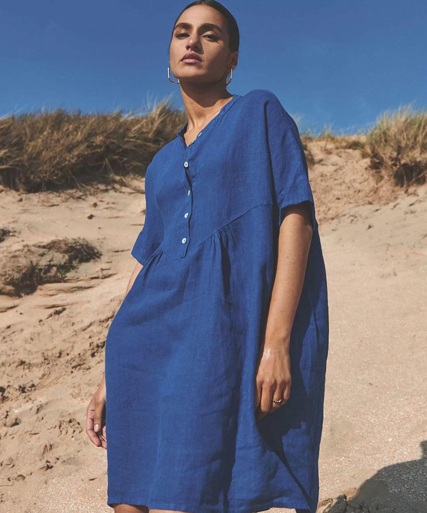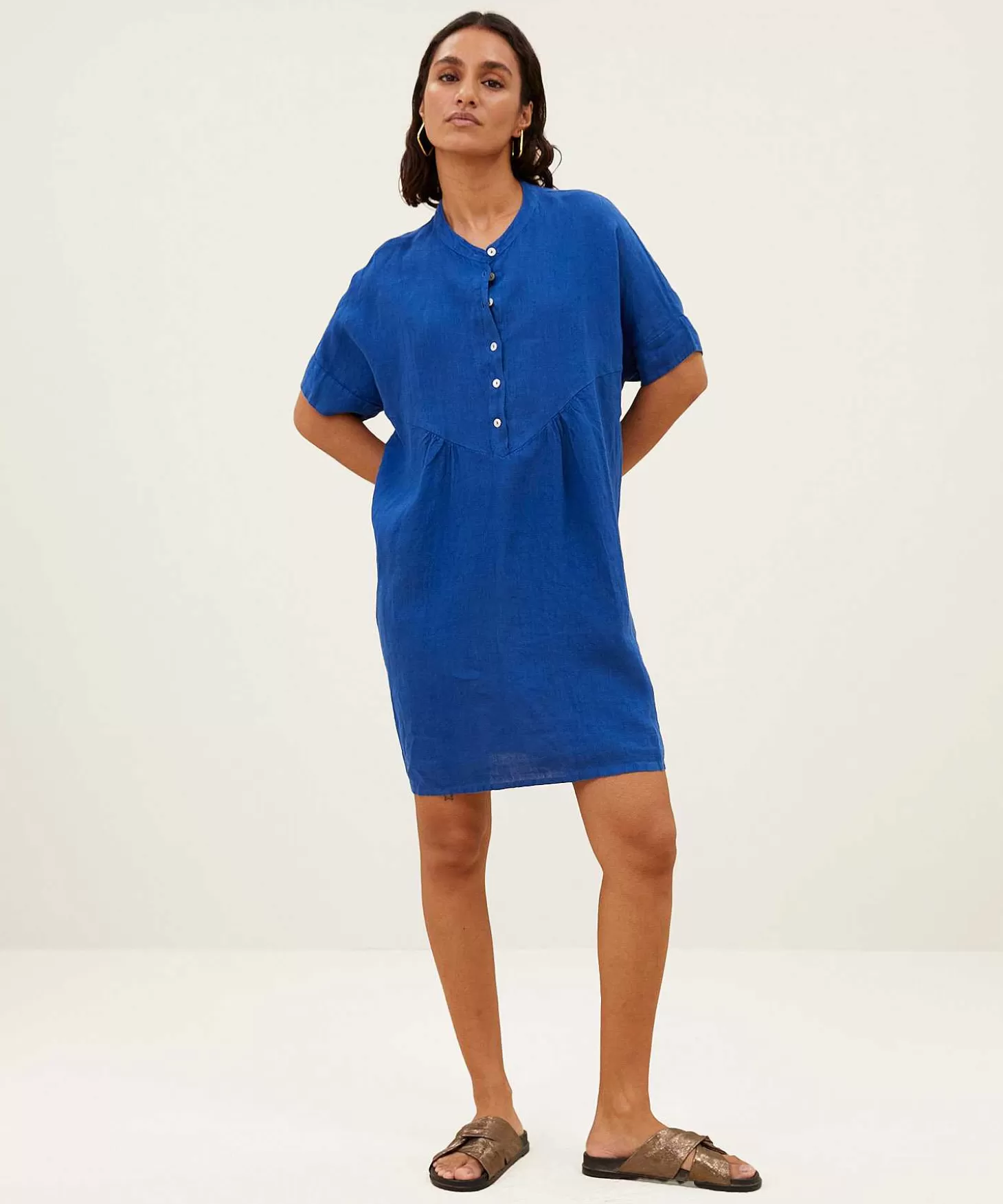 Deze Linnen By-Bar Jurk Wordt Jouw Zomerse Favoriet. Wat Een Luchtige Zomerjurk Met Haar Losse Fit, Korte Aangeknipte Mouw, Ronde Hals Met Knoopsluiting En Pas In V-Vorm Met Fijne Plooitjes. Dit Wijde Model Valt Boven De Knie En Is Verkrijgbaar In Camel En Oceaanblauw.