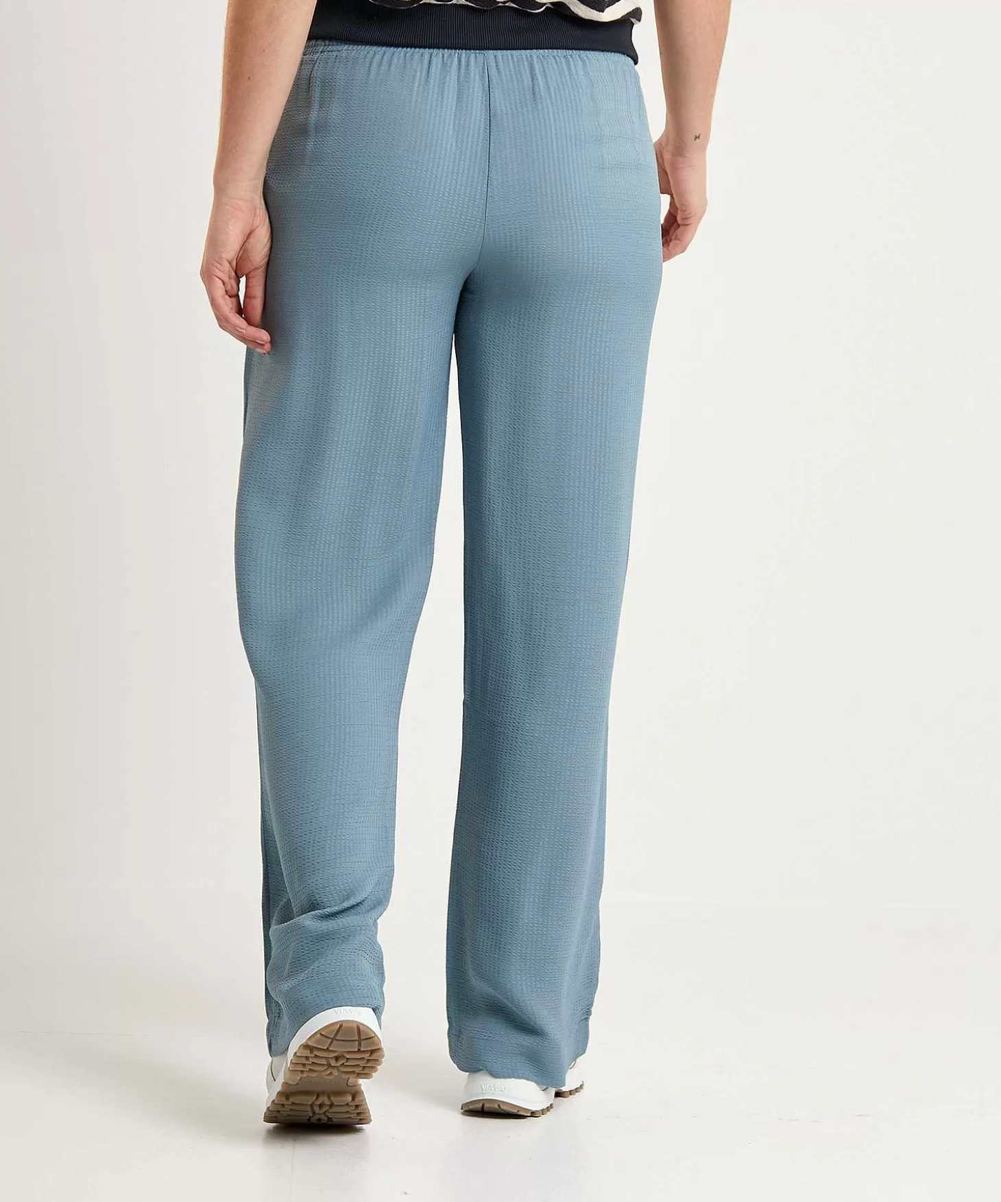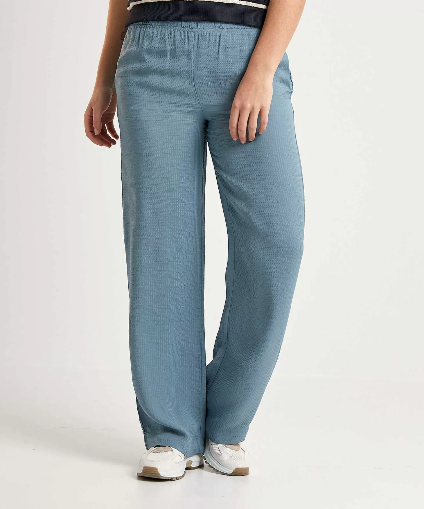 Luchtig En Licht Is Deze By-Bar Palazzo Broek Met Speels Reliëf Klaar Voor Hogere Temperaturen. In Een Vergrijsde Groen/Blauwe Kleur Past Ze Bij Veel En Met Haar Wijde Pijp Wil Ze Flaneren Als Een Palazzo Langs Het Terrazzo. Haar Elastische Tailleband + Steekzakken Maken Haar Jouw Lievelingsbroek En Ze Past Bij Veel. Draag Robyn Met Een Blouse, Knitwear Of Bretonse Streeptop + Loafers Of Sneakers. Samenstelling: 100% Viscose.