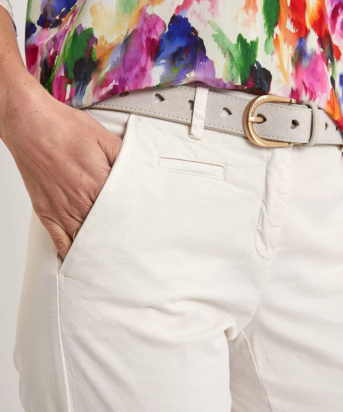 Stella Is Een Klassieke Chino Van Cambio Met Een Sportieve Fit. Zie Je Haar Eenvoudige Sluiting, Fake Muntzakje + Paspels Achter (Karakteristiek Voor Een Chino!), Steekzakken, Persvouwen En Kortere Pijp Met Vaste Omslag? In Neutraal Wit, Kiezel, Zand Of Blue Is Er Altijd Eentje Naar Jouw Garderobe En Ze Past Bij Veel. Je Draagt Deze Zonnige Broek Met Knitwear, Een Blouse + Blazer, Bretonse Streeptop Of Een T-Shirt. Loafers, Sneakers, Boots Of Sandaaltjes Erbij En Je Bent Altijd Sporty & Classy Op Je Best. Samenstelling: 97% Katoen, 3% Elastan.