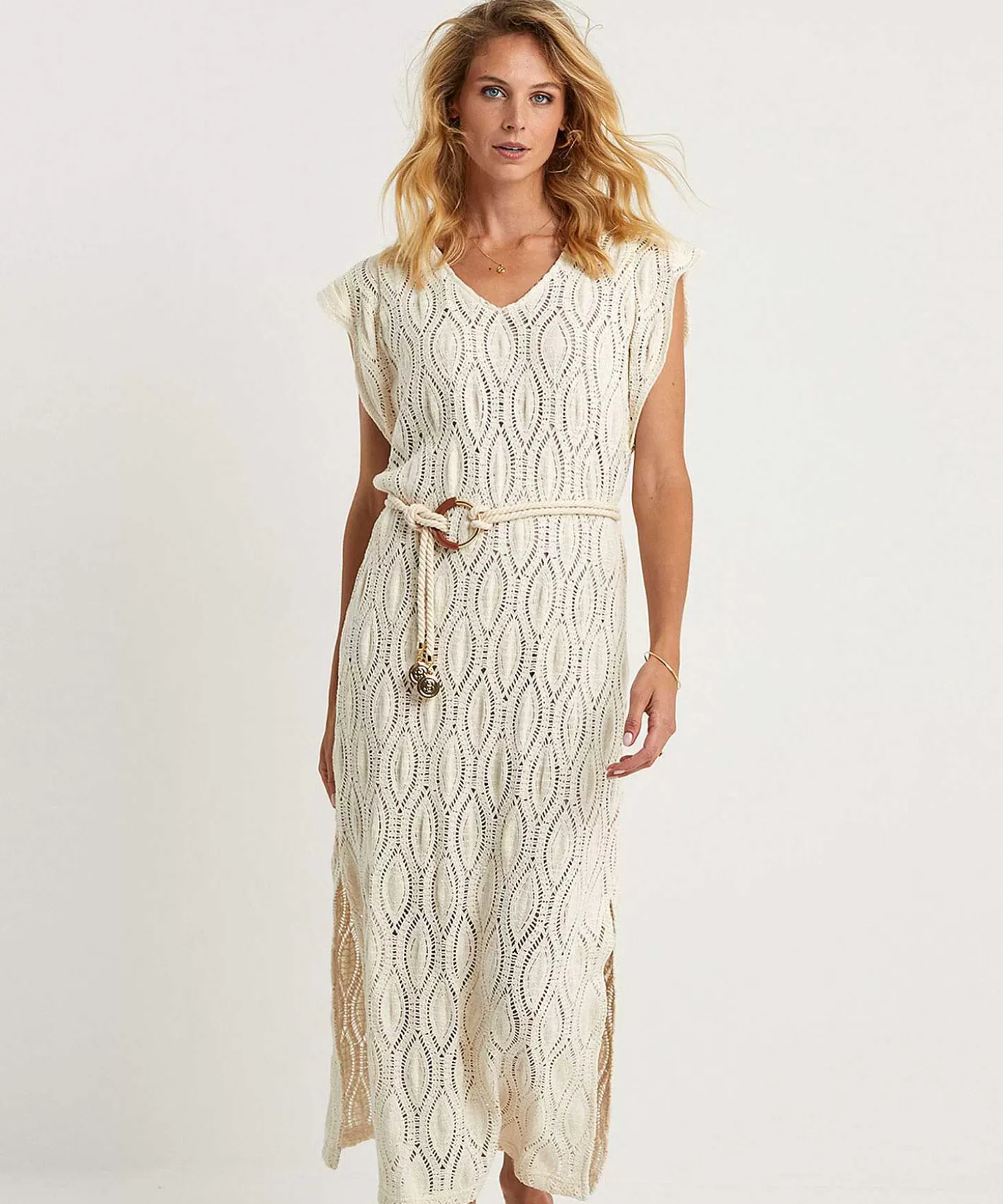 Zomerse Elegantie, Dat Is Wat Je Draagt Met Deze Opengewerkte Zandkleurige Jurk In Een Weergaloos Vrouwelijk Model. De Kuitlange Jurk Heeft Een Prachtig Silhouet, Extra Onderstreept Door De Sierlijke Tailleband, Gemaakt Van Een Grote Gesp En Goudkleurige Details. De Jurk Heeft Korte Kapmouwtjes, Waar Je Niet Bij In Kijkt, Doordat De Jurk Er Onder Door Loopt. De Jurk Is Volledig Gevoerd En Heeft Een V-Hals. Combineer Met Je Favoriete Sieraden En Kies Ecrukleurige Of Zandkleurige Sandalen En Stem Ook De Kleur Van Je Tas Hierop Af. Samenstelling: 100% Katoen.