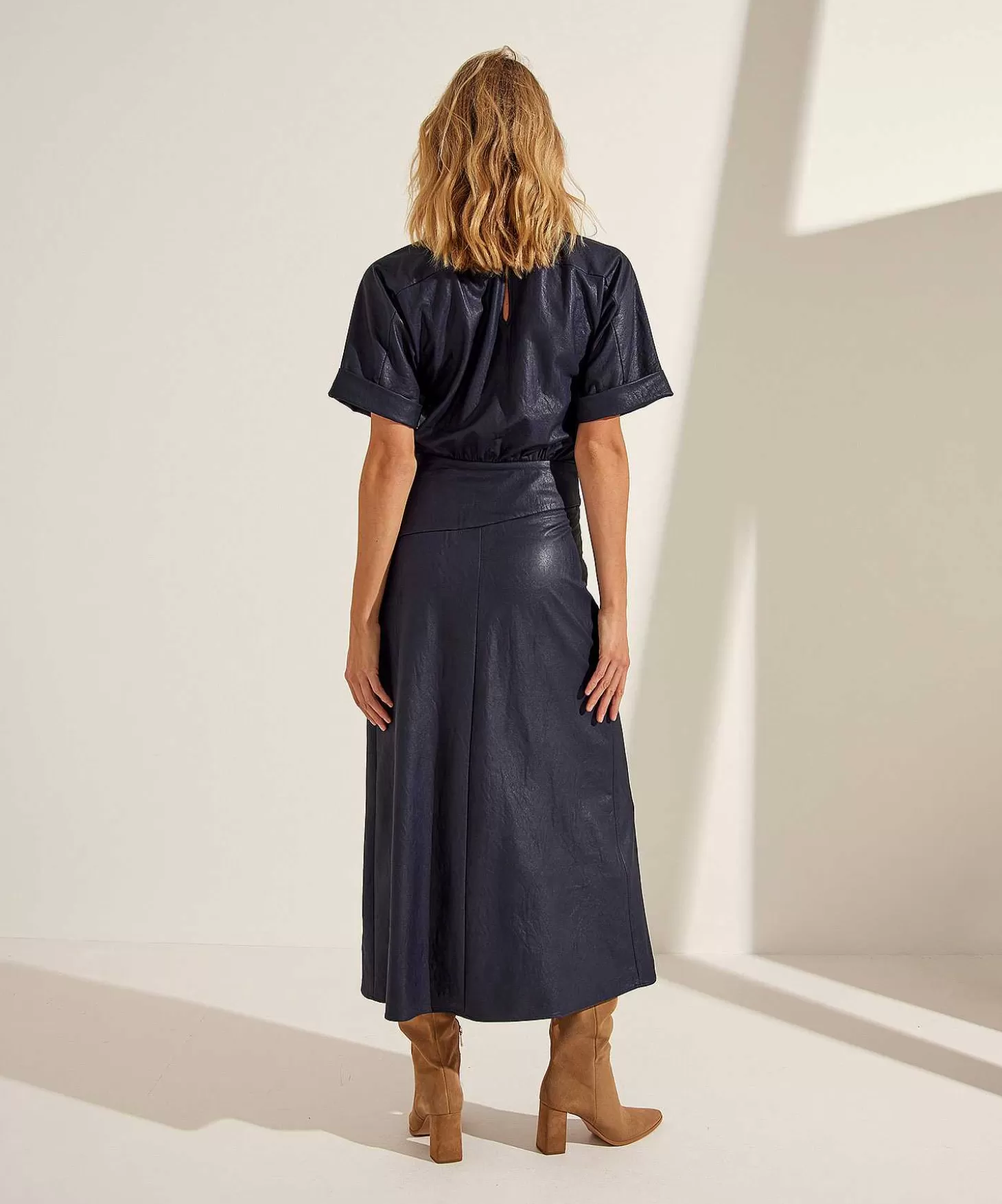 Van Vegan Leer Is Deze Caroline Biss Jurk Pure Highfashion. Zie Je Haar Korte Aangeknipte Mouw, De Keyhole-Sluiting Achter En De Afgeronde Pas? In Donker Indigo (Nachtblauw), Met Een Werkje In Het Soepele Vegan Leather En Een Asymmetrische Tailleband Is Ze Op Je Lijf Geschreven. Tel Daar De Rok Met Afgeronde Overslag Bij Op Die Je Benen Fraai Omlijst En Je Bent Verkocht. Je Draagt Deze Statementjurk Met Glanzende Of Kleurige Accessoires En Natuurlijk Met High Heels Aan Je Voetjes. Biss Biss! Samenstelling: 82% Polyester, 11% Pu, 7% Elastan.