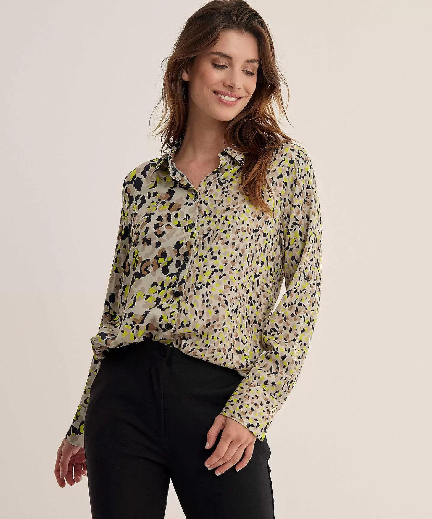 Een Dierprint In Een Kleine En Een Uitvergrote Versie Gecombineerd In Één Blouse En Afgewisseld In De Panden. Deze Blouse Is Beslist Niet Doorsnee, Zeker Niet Door De Kleurencombinatie Van Zand Met Camel Bruin, Zwart En Accentkleur Neon Groen/Geel. De Blouse Heeft Een Kraagje En Brede Manchetten. Ze Sluit Met Zwarte Knoopjes En Aan De Mouw Met Een Sierlijke Goudkleurige Knoop. Combineer Deze Blouse Op Een Wide Leg Broek In Zand, Beige Of Zwart En Maak Af Met Een Vest Of Blazer. Hakken Of Stoere Sneakers Kunnen Beide. Samenstelling: 100% Viscose.
