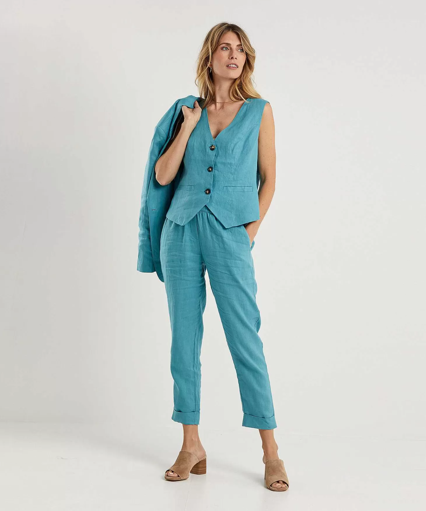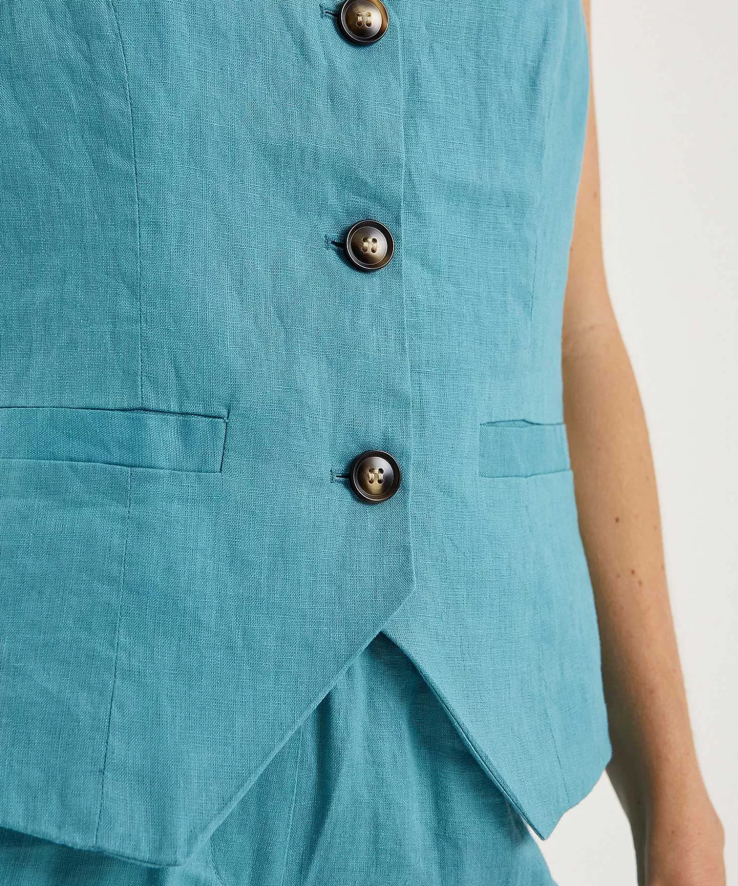 Emotions Combineert Een Klassiek Gilet Met Zomers Linnen. In Een Neutrale Zandkleur Of Donker Turquoise Met Een Lichaam…