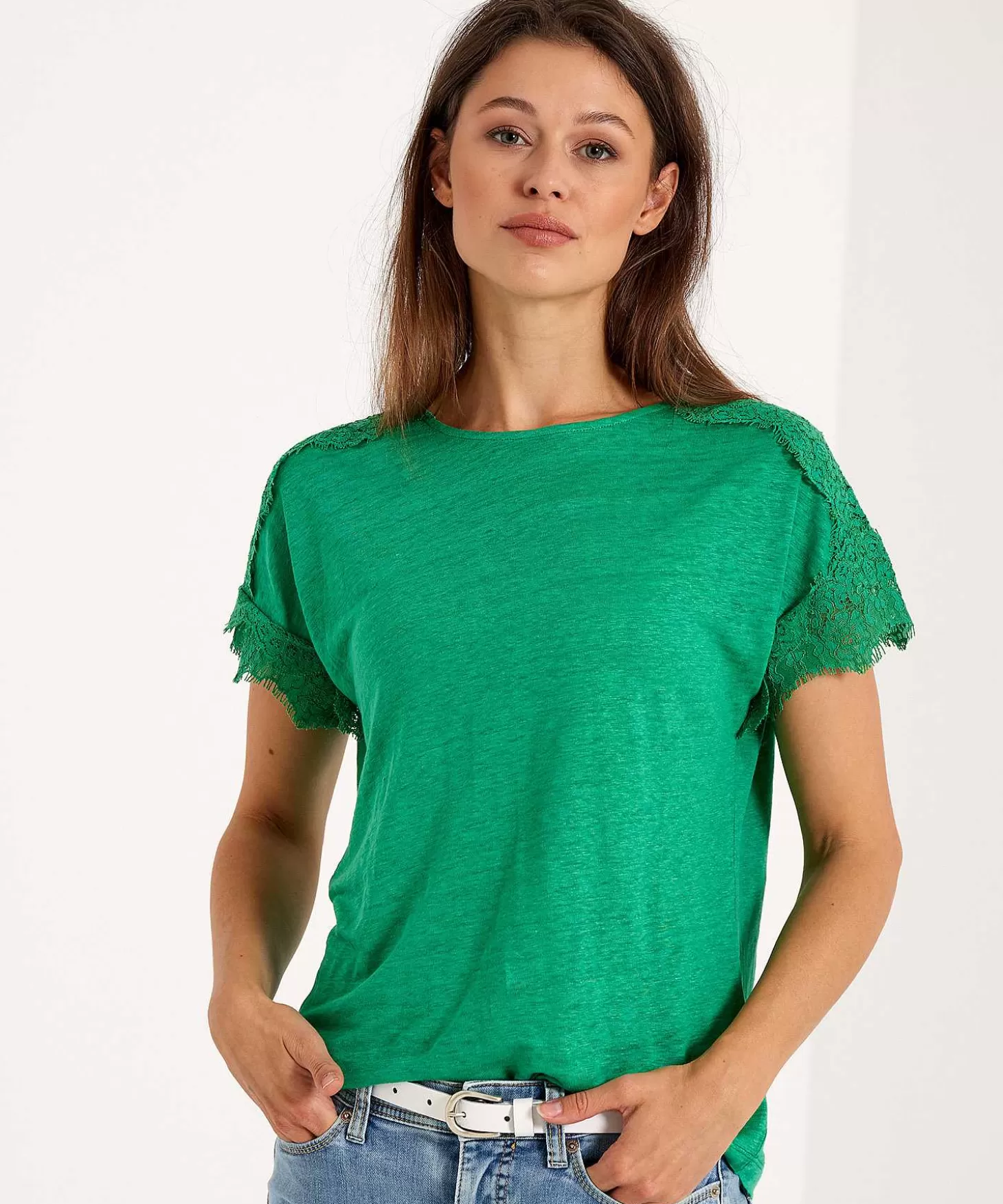 No Mixted Emotions Met Dit Linnen Emotions Shirt Met Kanten Inzet Langs De Hals En Schouders. Wat Een Vrolijke Mooi-Weer-Top In Groen Of Vergrijsd Blauw Linnen Met Kort Aangeknipt Mouwtje – Dubbel Luchtig En Super Feminien. Je Draagt Dit Shirt Met (Nu Nog) Een Blazer Of Vestje, Een Pantalon Of Palazzo En Loafers Naar Een Feestje Of Je Werk. Maar Ook Op Stedentrip Met Een Jeans En Sneakers + Een Denim Jasje Of Trenchcoat Oog Je Minimal Chic En Sportief. Met Shorts En Slippertjes Is Het Fashionable Struinen Door De Duinen, Wat Doe Jij? Samenstelling: 100% Linnen. Kantstof: 65% Katoen, 35% Polyamide.
