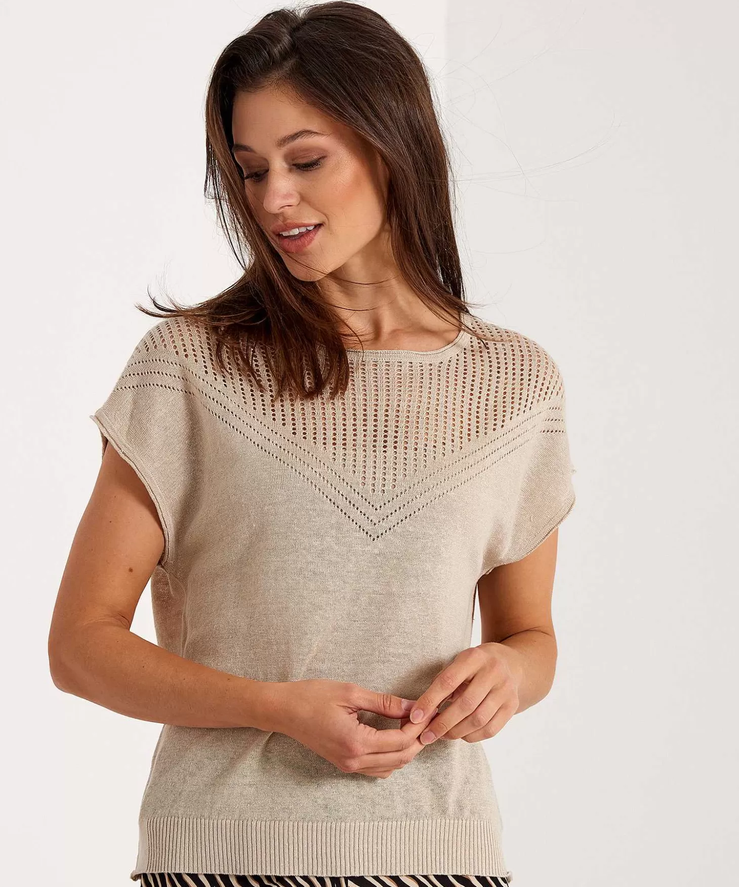 Dit Linnen Truitje Van Emotions Is Met Haar Pointelle Hals Ready For Summer. Wat Een Geraffineerd Opengewerkt Patroon In V-Vorm Dat Doorloopt In De Korte Aangeknipte Mouw En De Achterkant. Losjes Maar Feminien In Luchtig Linnen Combineer Je Deze Top Met Alles Uit Jouw Garderobe, Zoals Met Een Pantalon (En Nu Nog Onder Een Blazer) + Loafers Of High Heels Naar Kantoor Of Een Party. Maar Ook Met Een Jeans Of Maxi-Rok En Sandaaltjes Of Sneakers Struin Jij In Stijl Door Smalle Straatjes Op Stadse Avonturen. Verkrijgbaar In Zand En Marine. Samenstelling: 100% Linnen.