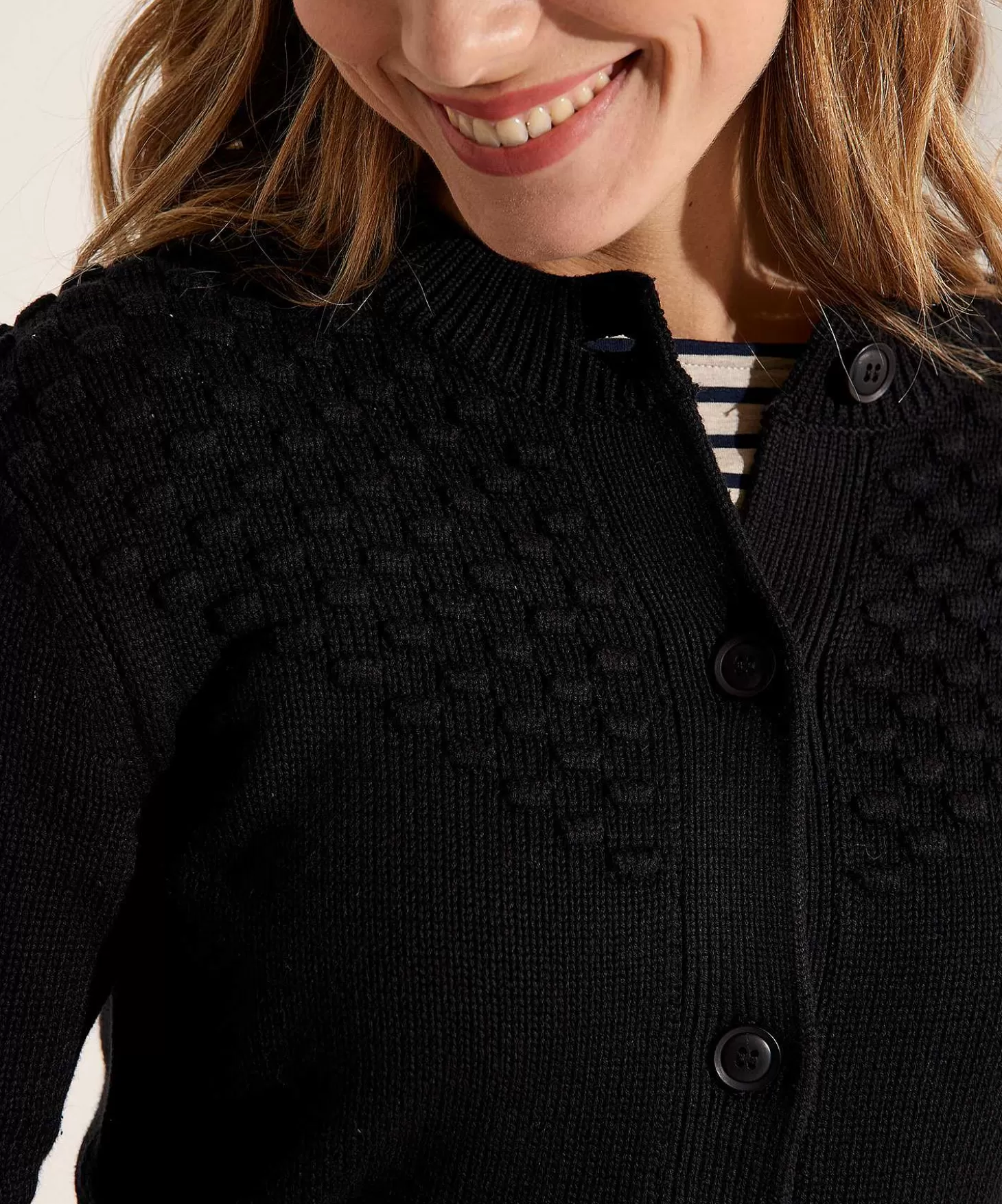 Wie Is Niet In Zijn Nopjes Met Dit Emotions Bolletje Vest? Wat Een Speels Breisel In 3D Met Bolletjes In V-Vorm Op Het Voorpand En Langs De Bovenarm. In Een Neutrale Zwarte Kleur En Aangename Katoenmix Draag Je Dit Vestje De Seizoenen Door. Naast De Speelse Noppen Is Het Model Minimalistisch Met Een Ronde Hals, Knoopsluiting En Relaxte Pasvorm. Je Draagt Haar Met Een Jeans En Laarsjes Voor Een Tijdloze Casual Look En Wat Dacht Je Van Samen Met Een Pantalon En Loafers Op Kantoor? Gecombineerd Met Een Vegan Leren Rok Of Broek En High Heels Rock Je Elke Party. Samenstelling: 55% Katoen, 45% Polyacryl.