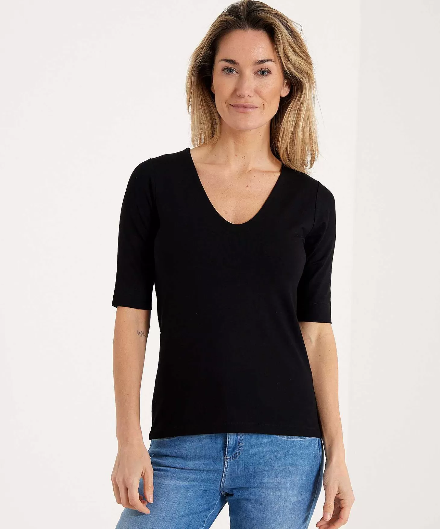 Essentieel En Double Fun, Dat Is Dit Dubbelpandig Shirt Absoluut. Splinternieuw Uit De Essentials Huiscollectie Is Deze Top Een Onmisbaar Item. Zie Je Haar Dubbele Voorpand, Minimalistische V-Hals En Voel Je Haar Zachte Stretchy Viscose? Dankzij Haar Allround Kleuren (Marine, Zwart En Zomers Offwhite) Past Ze Bij Alles Uit Jouw Garderobe. Je Draagt Haar Onder Knitwear, Een Blazer Of Denim Jasje Samen Met Een Pantalon, Maxi-Rok Of Jeans. In De Zomer Draag Je Haar Als Haar Fraaie Zelf Met Shorts, Een Printrok Of Capri Met Sandaaltjes Voor Een Tijdloze Klassieke Of Sportieve Look. Samenstelling: 95% Viscose, 5% Elastan.