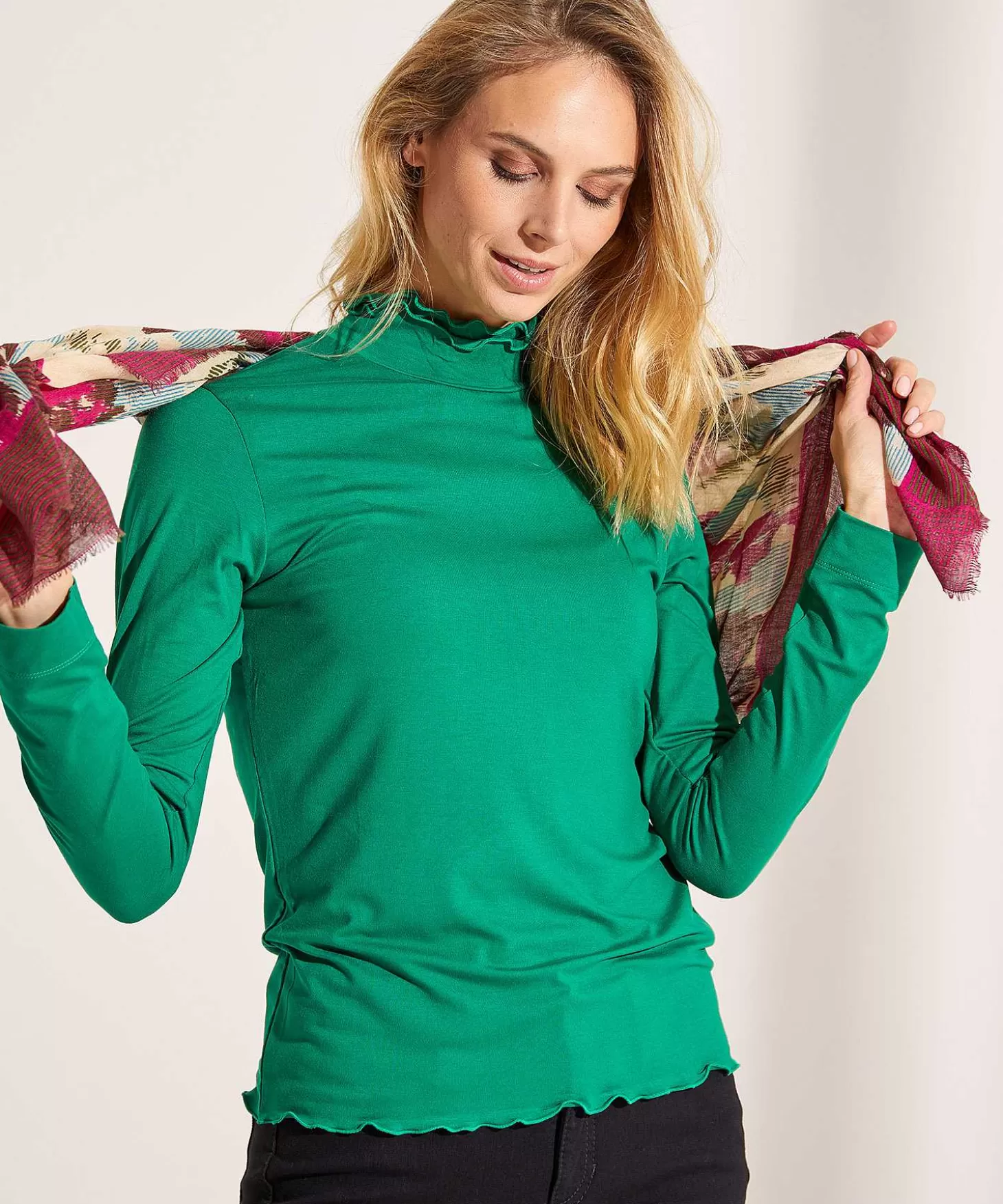 Niet Voor Niets Een Essential Dit Basisshirt Met Col En Dubbele Ruffles. Dit Shirt Draag Je Onder Je Blazer Of Vest. Op Een Wide Leg Pants Of Flared, Maar Ook Je Jeans Wordt Blij Van Deze Alleskunner. Niet Alleen Een Essential, Ook Nog Eens Gegarandeerd Een Prachtige Kwaliteit. Verfijnde Jersey In Een Winterwarme Rekbare Kwaliteit. De Ruffle Komt Aan De Onderzijde Terug En De Mouwen Hebben Een Brede Vastgenaaide Rand. Verkrijgbaar In De Kleuren Groen, Donker Paars, Deep Fuchsia, Ocean Blauw En Cognac (Bruin). Samenstelling: 95% Viscose, 5% Elastan.