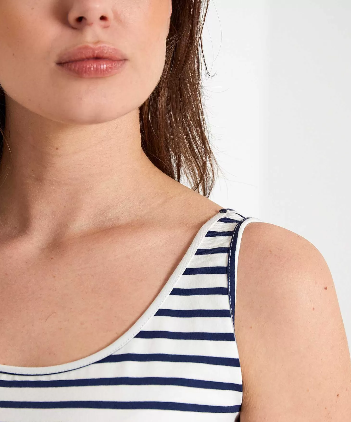 Met Deze Essentials Singlet Heb Je Altijd Een Streepje Voor. Zie Je Haar Bretonse Streep En Voel Je Haar Zachte Elastische Katoen? Met Haar Comfortabele Aansluitende Fit En Lengte Past Ze Onder Ieder Vest Of Blazer En Straks Bij Hoge Temperaturen Draag Je Haar Als Haar Fraaie Zelf. Samen Met Een Jeans, Pantalon, Jogger, Maxi-Rok Of Shorts + Loafers, Sneakers Of Sandaaltjes Ben Jij Altijd Op Je Maritieme Best. Ship Ahoy Sailorettes! Verkrijgbaar In Marine/Offwhite, Kobalt/Wit, Hemelsblauw/Offwhite En Koraal/Wit. Samenstelling: 95% Katoen, 5% Elastan.