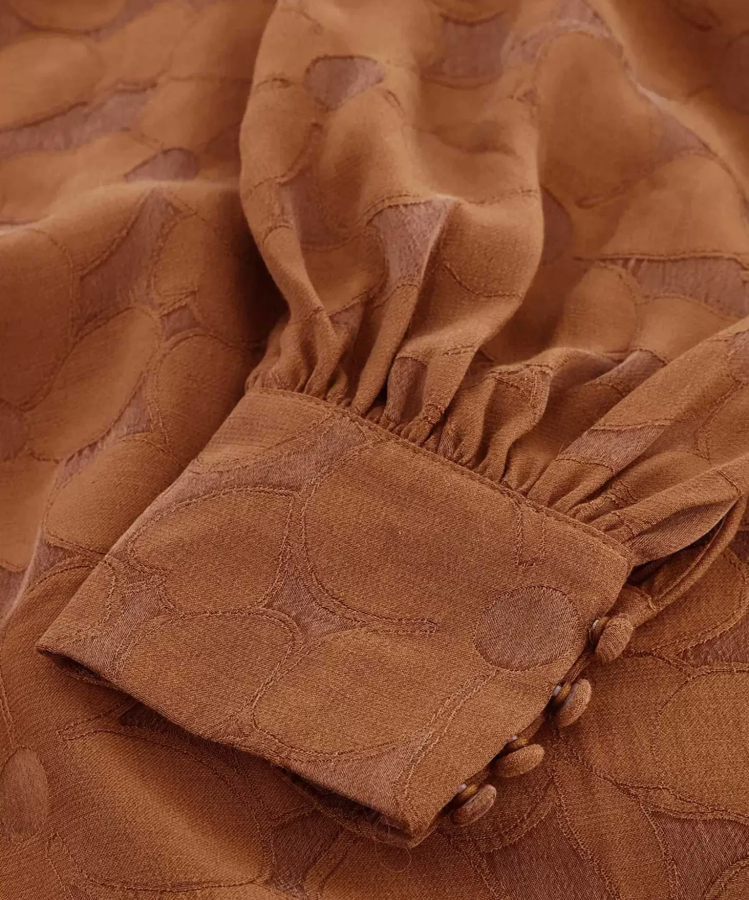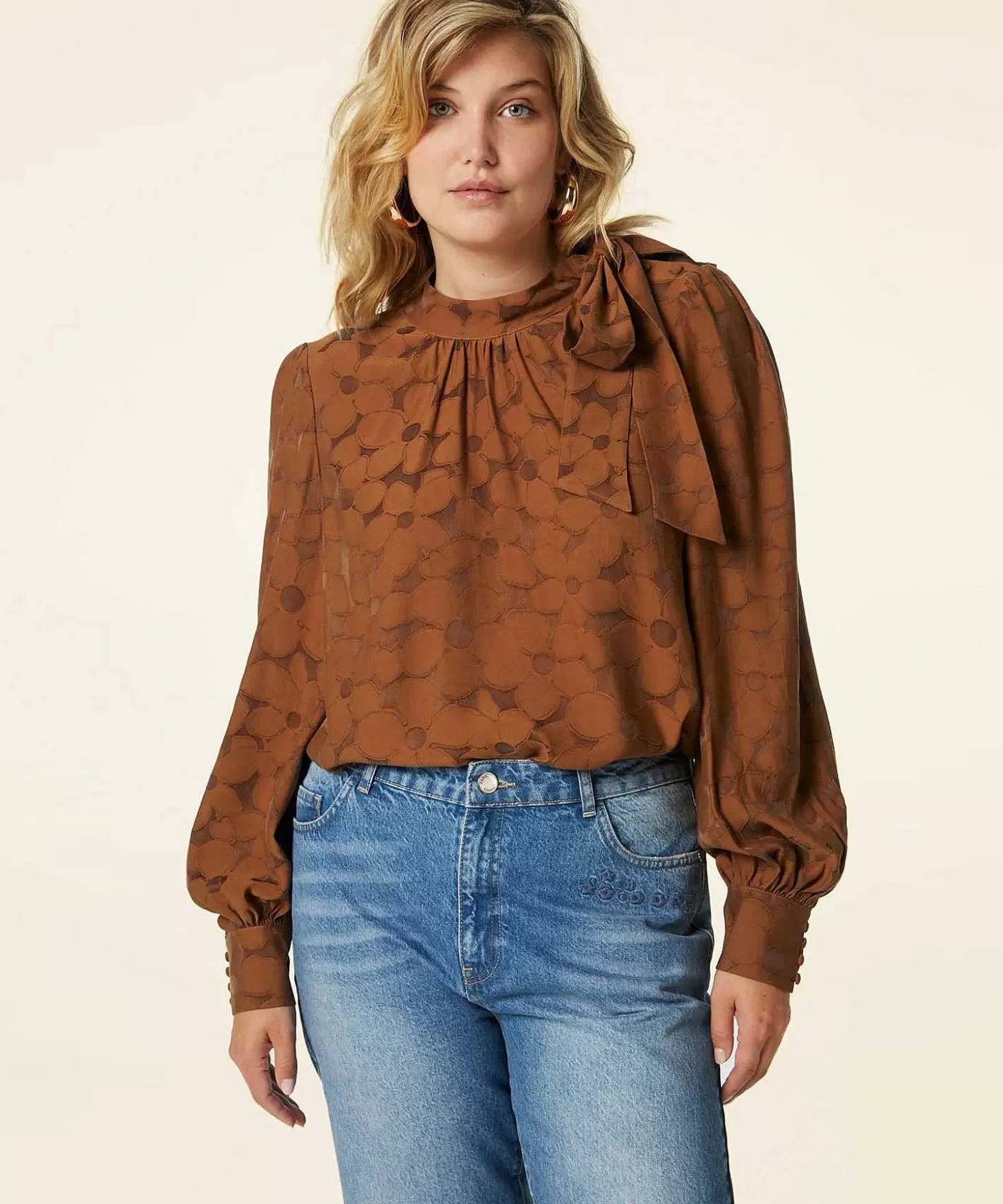 Wat Een Snoepje Van Een Blouse Is Deze ‘Michou’ Uit De Collectie Van Fabienne Chapot. Ook Nog Eens Uitgevoerd In Een Snoepkleur Genaamd ‘Toffee’ Die Helemaal Recht Doet Aan Het Seizoen. De Blouse In Een Zachte Bruintint Heeft Een Ingeweven Bloemenprint Waarvan Delen Licht Transparant Zijn. Deze Top Sluit Hoog Met Een Strikdetail In De Hals, Ze Heeft Ballonmouwen En Brede Manchetten Met Gestoffeerde Knoopjes. Combineer Haar Met Een Jeans Of Ga Voor De Combinatie Met Een Lange Rok. Kies Voor Tinten Uit Hetzelfde Pallet Voor Een Rustige Naturel Look, Of Combineer Juist Verfrissend Door Contrastkleuren Toe Te Voegen. Samenstelling: 54% Cupro, 46% Viscose.