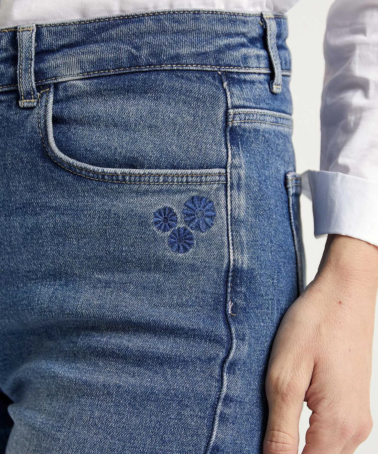 Sierlijke Flared Jeans Eva Uit De Collectie Van Fabienne Chapot. Gemaakt Van Een Stevige Jeans In Een Middenblauwe Kleur. Vanzelfsprekend Ontbreken Niet De Karakteristieke Details Die We Van Fabienne Mogen Verwachten. Geborduurde Bloemetjes Bij De Zakken En Een Knoopsluiting In Zachtblauw Logo. De 5-Pocket Jeans Heeft Een Mid Rise Pasvorm En Combineert Geweldig Met Uitgewerkte Blouses Of Een Fijn Breiseltje Zoals Een Vestje Of Truitje. Mid Rise, Flare Leg. Samenstelling: 99% Katoen, 1% Elastan.
