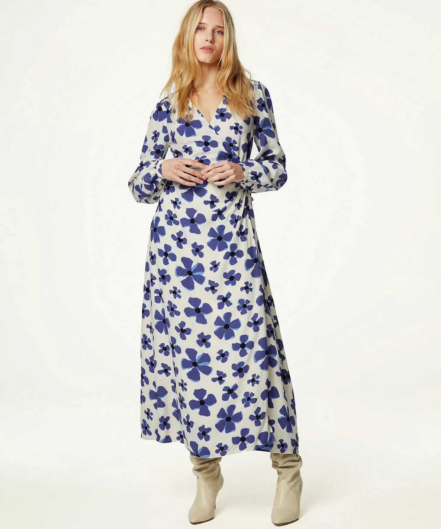 Roomwitte Elegantie Gecombineerd Met Een Strooisel Van Lavendelblauwe Bloemen En Vormgegeven In Een Weergaloze Lange Jurk Uit De Collectie Van Fabienne Chapot. Deze Zomer Draag Je Overslagjurk Nia Zwierig En Sierlijk Met Een Hoge Hak Of Een Sandaaltje En Gelakte Nagels! De Jurk Heeft Lange Mouwen Met Geplooide Mouwinzet En Stofbeklede Knoopjes. Of Je Nu Een Zomers Dagje Uit Gaat Of Je Hebt Een Feestelijke Trouwerij, Deze Jurk Laat Je Stralen. Samenstelling: 61% Viscose (Lenzing™ Ecovero™), 39% Viscose.