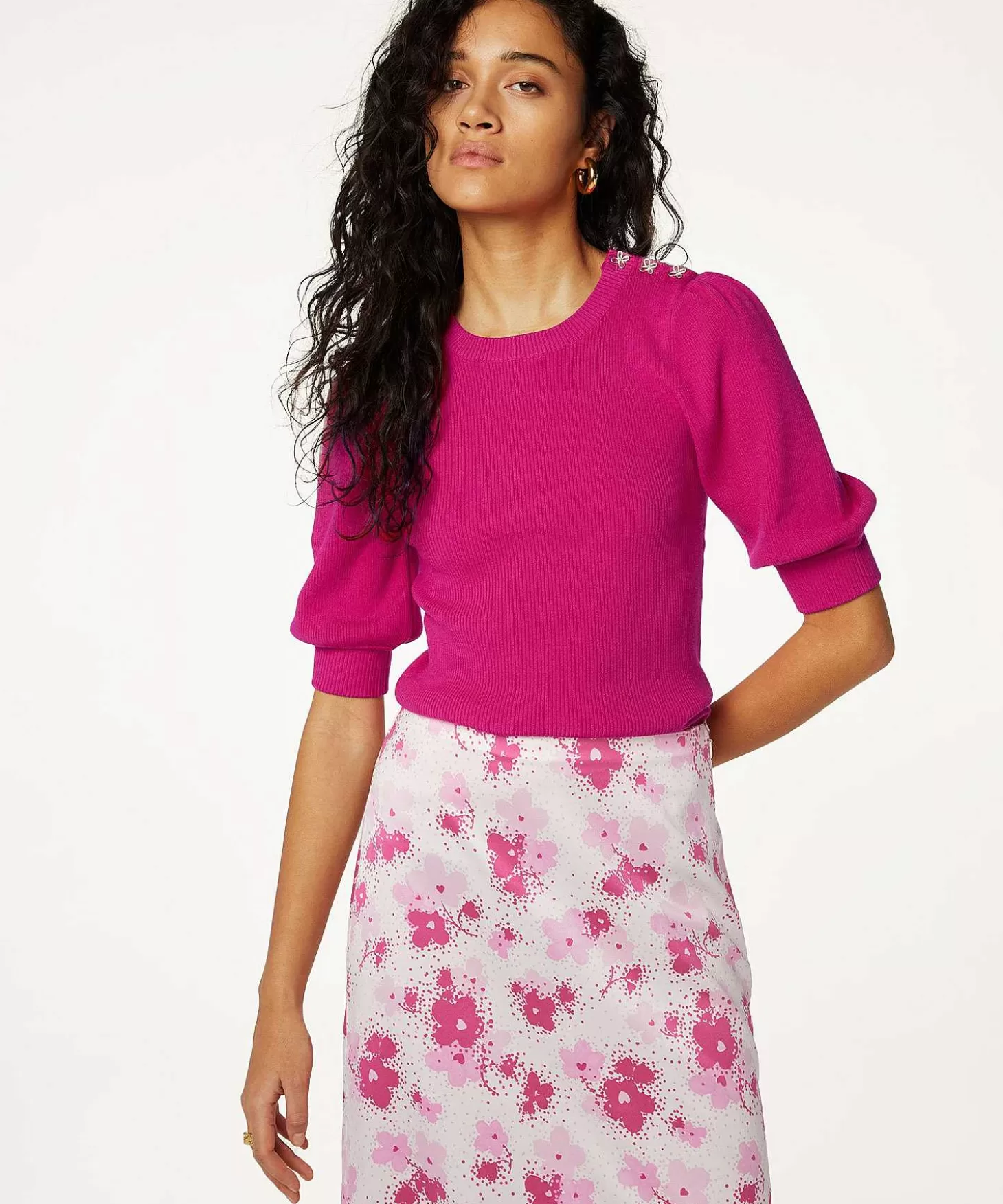 Truitje Lilian Uit De Collectie Van Fabienne Chapot Is Een Echte Alleskunner. Combineer Haar Met Je Fabienne Chapot Items Zoals Een Zwierige Rok, Maar Draag Ook Gerust Op Je Favoriete Jeans Of Denim Skirt. Dit Truitje Is Ribgebreid En Heeft Een Rechtvallende Pasvorm. De Ronde Hals Sluit Op De Linkerschouder Met Drie Sierlijke Goudkleurige Bloemknoopjes. De Korte Mouw Valt Tot Net Boven De Elleboog En Heeft Door De Geplooide Inzet Een Poffend Effect. De Fuchsia Roze Kleur Is Om Van Te Smullen En Geeft Je Outfit Net Even Dat Extra Stukje Pit. Samenstelling: 70% Viscose, 28% Nylon, 2% Elastan.