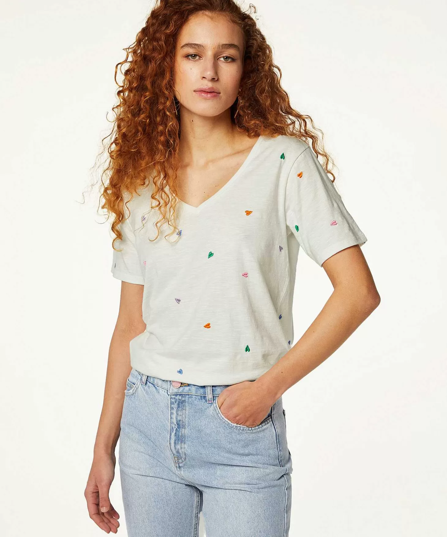 Niet Zomaar Even Een Printje Van Hartjes, Maar Een Veelheid Van Geborduurde Hartjes Vind Je Terug Op Dit Roomwitte Shirt Phil, Met Ruime V-Hals Uit De Collectie Van Fabienne Chapot. Geborduurde Hartjes In Een Serie Frisse Zomertinten Variërend Van Blauw, Groen, Fuchsia, Lila En Oranje. Dit Rechtvallende Shirt Combineer Je Een Zomer Lang Bij Je Lange Zomerse Rok Of Bij Je Denim Skirt Of Jeans. Gemaakt Van Zachte Biologische Katoen, Voor Lekker Koel Draagcomfort. Samenstelling: 100% Biologisch Katoen.