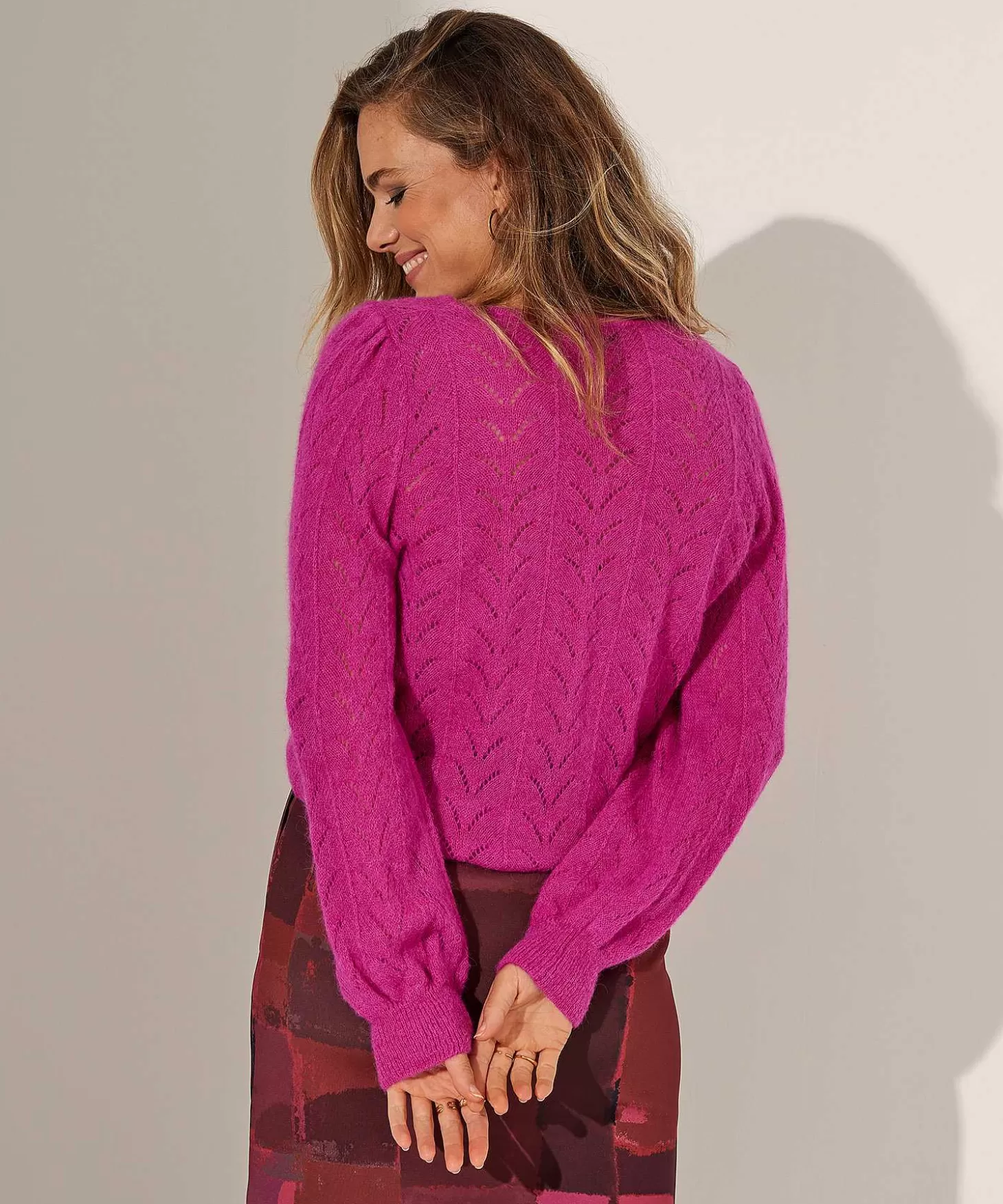 We Love Alpaca En Dit Giulia E Tu Truitje In Ajourbreisel Is Er Vol Van. In Een Aangename Alpacamix, Een Losse Maar Feminien Fit En Het Mooiste Ajourpatroon Wordt Dit Model Jouw Favoriet. Zie Je Haar Zachte Lila Of Deep Fuchsia En Opengewerkte Motief Van Verticale Banen En Gespiegelde Ronde Vormen? Je Draagt Deze Trui Met Een Pantalon En Loafers Of High Heels Op Je Werk Of Een Feestje. Maar Ook Met Een Jeans En Laarsjes Creëer Je Een Boho Stijltje. En Dankzij Haar Lichte Dunne Breisel Draag Je Dit Truitje Het Jaar Rond, Want Alpaca Ademt En Houdt Je Altijd Comfortabel Op Temperatuur. Samenstelling: 62% Alpaca, 38% Polyamide.