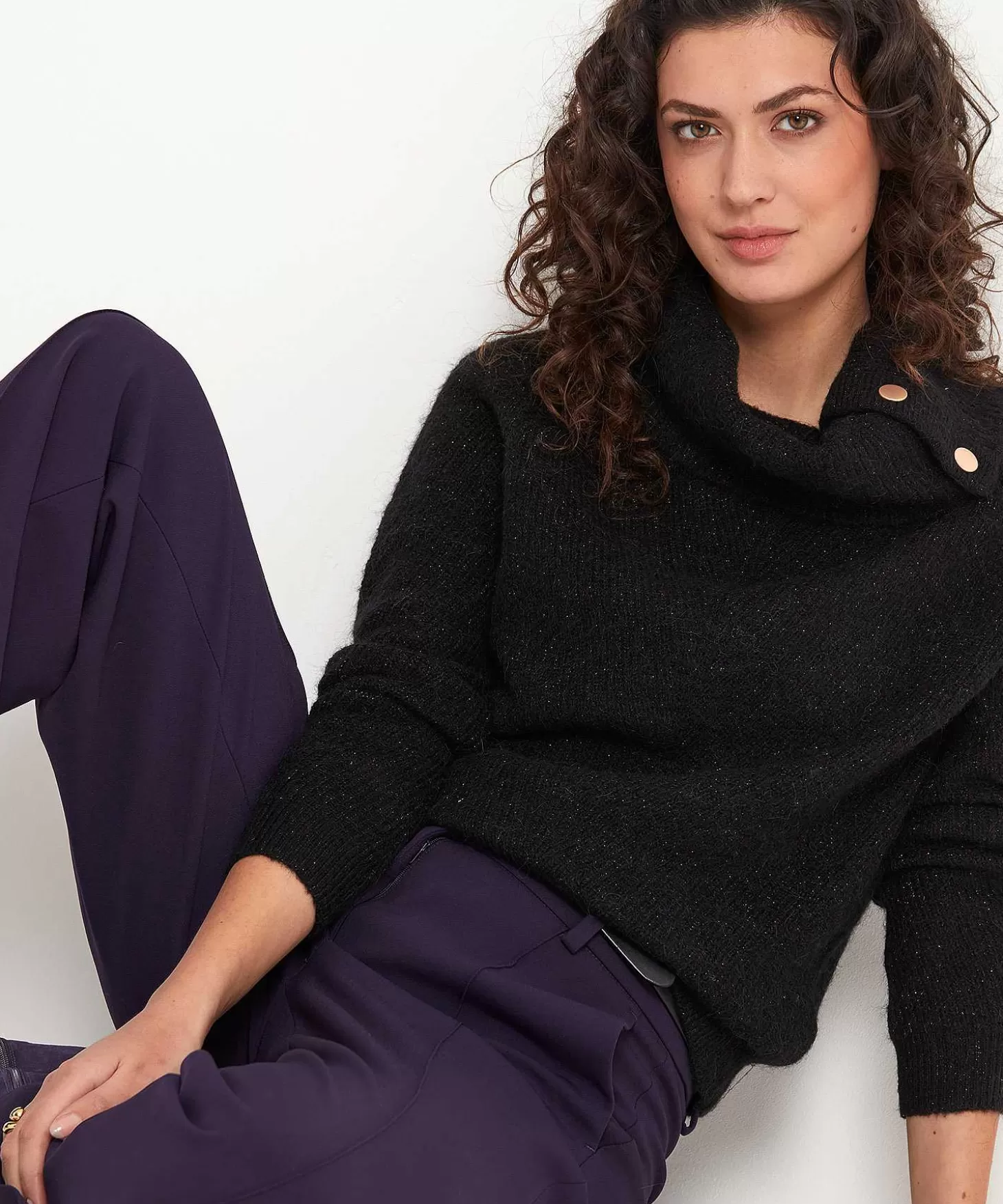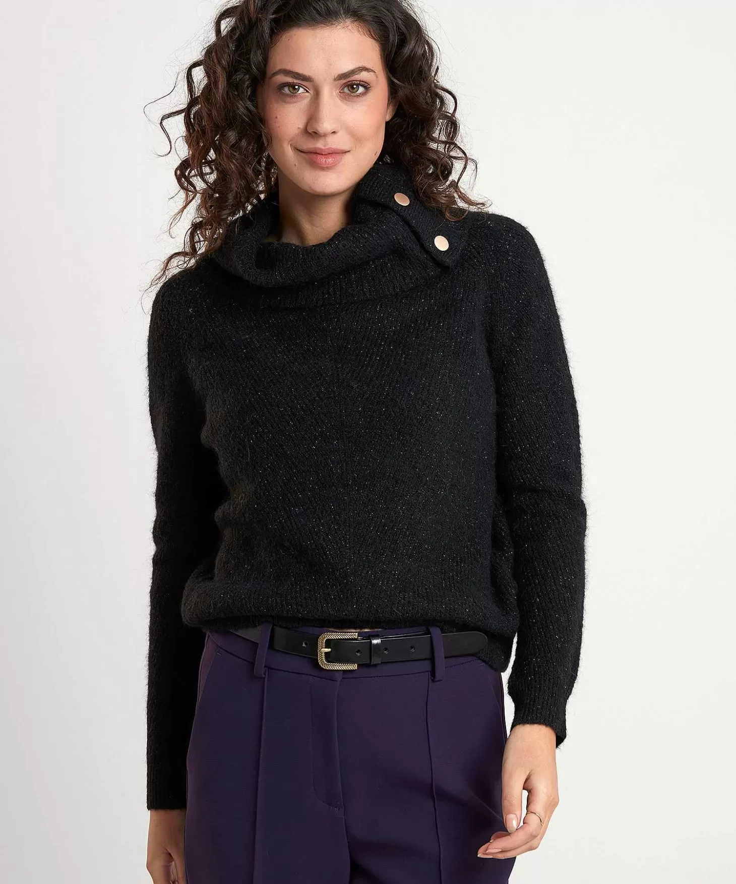 Deze Giulia E Tu Coltrui Mixt Wol En Alpaca Met Diagonale Lijnen En Knoopjes. Voel Je Haar Zachte Breisel En Zie Je Haar Diagonaal Open Te Knopen Col Met Goudkleurige Knoopjes? In Een Relaxt Recht Model Is Deze Trui Door De Speelse Colkraag Nét Een Tikje Anders En Ze Ademt Pure Luxe. Je Draagt Haar Met Een Printbroek En Laarsjes Naar Je Werk, Maar Ook Een Pantalon, Jeans Of Vegan Leren Broek Kan Ze Makkelijk Hebben. En Wat Dacht Je Van Samen Met Een Plissérok? Boots, Loafers, Sneakers Of High Heels Eronder En Je Bent Weg Met Giulia. Beschikbaar In De Kleuren Paars, Zwart Met Glanzend Lurexdraadje En Ecru Met Glanzend Lurex Zilverkleurig Draadje. Samenstelling: 34% Acryl, 25% Polyamide , 20% Wol, 16% Alpaca, 5% Elastan.