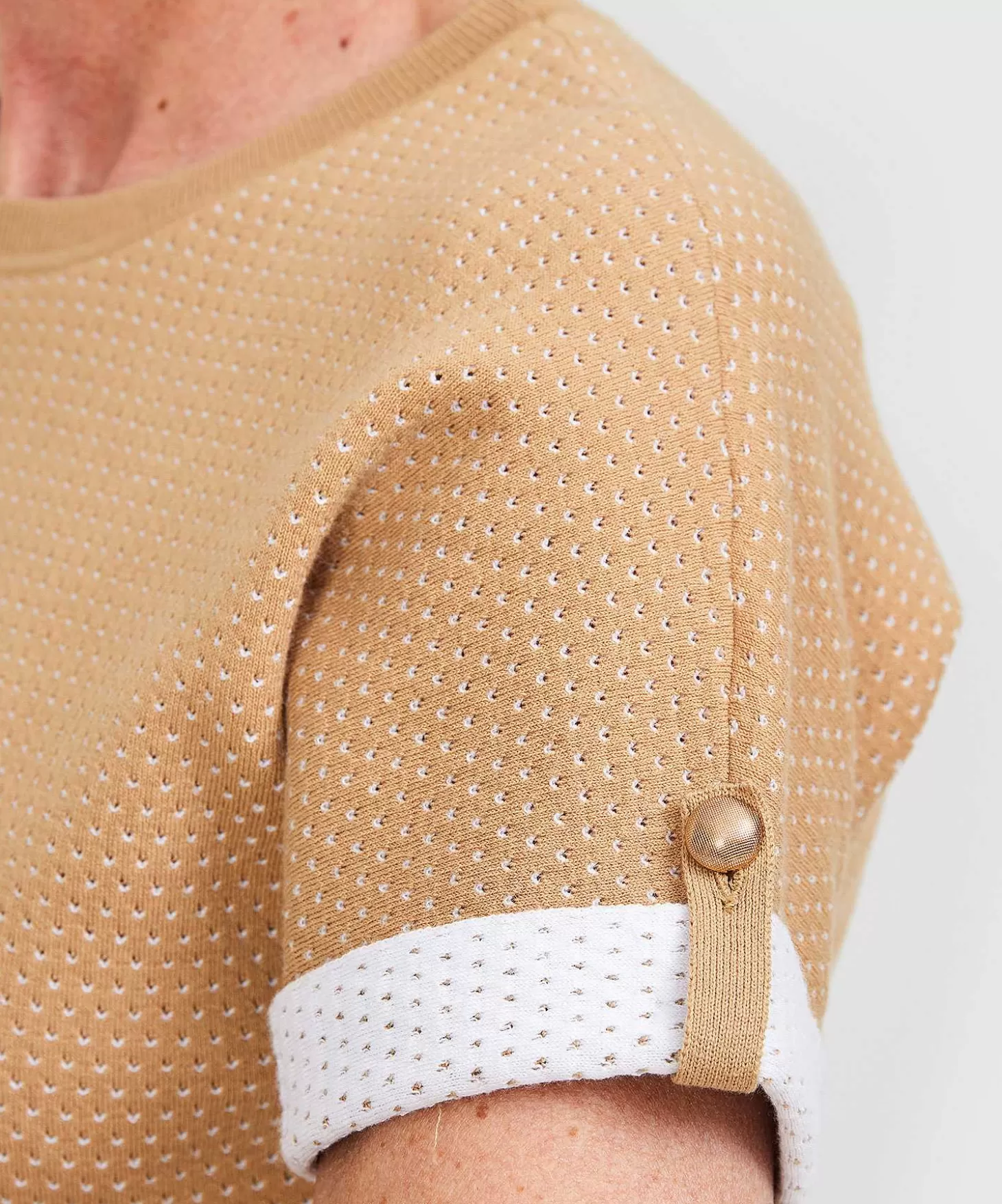 Deze Giulia E Tu Top Is Meer Dan Top! Met Haar Geweldige Opengewerkte Patroontje Straalt Ze Inside Out. De Witte Binnenkant Piept Ook Via De Mouwomslagjes Met Knoopsluiting Naar Buiten En De Brede Boorden Zorgen Voor Een Sportief Contrast. Verkrijgbaar In Zwart Of Zand Past Dit Truitje In Ieders Garderobe. Met Haar Feminien Fit Staat Ze Geweldig Boven Een Wijde Broek Of Rok In Ton Sur Ton Kleurtjes. Maar Ook Met Een Jeans En Sneakers Ga Jij Effortlessly Cool Op Citytrip. We Love Giulia! Samenstelling: 70% Katoen, 26% Polyester, 4% Elastan.