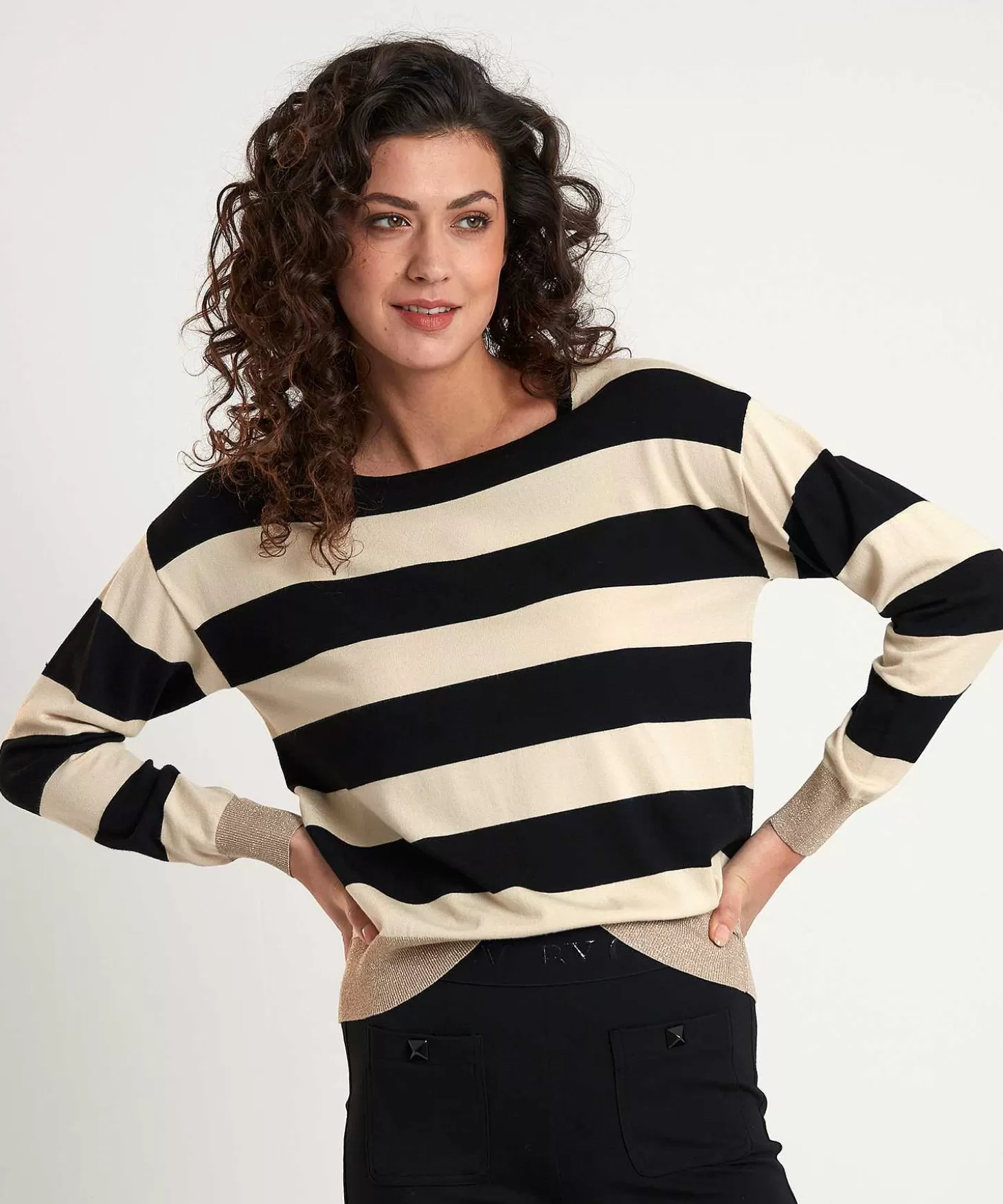 Dun Gebreid En Met Sportieve Streep Is Dit Giulia E Tu Truitje Een Hele Fraaie. Zie Je Haar Ronde Hals, Zwarte Strepen Op Kiezel En De Zandkleurige Boorden Met Goudkleurige Lurex? Met Haar Losse Pasvorm En Aansluitende Tailleboord Valt Ze Sportief En Feminien Tegelijk. Je Combineert Haar Met Een Pantalon Of Vegan Leren Broek (Of Rok) + Loafers Naar Je Werk Of Een Feestje. Maar Ook Met Een Jeans En Boots Creëer Je Een Sporty & Classy Stijltje. Samenstelling: 73% Viscose, 27% Polyamide.