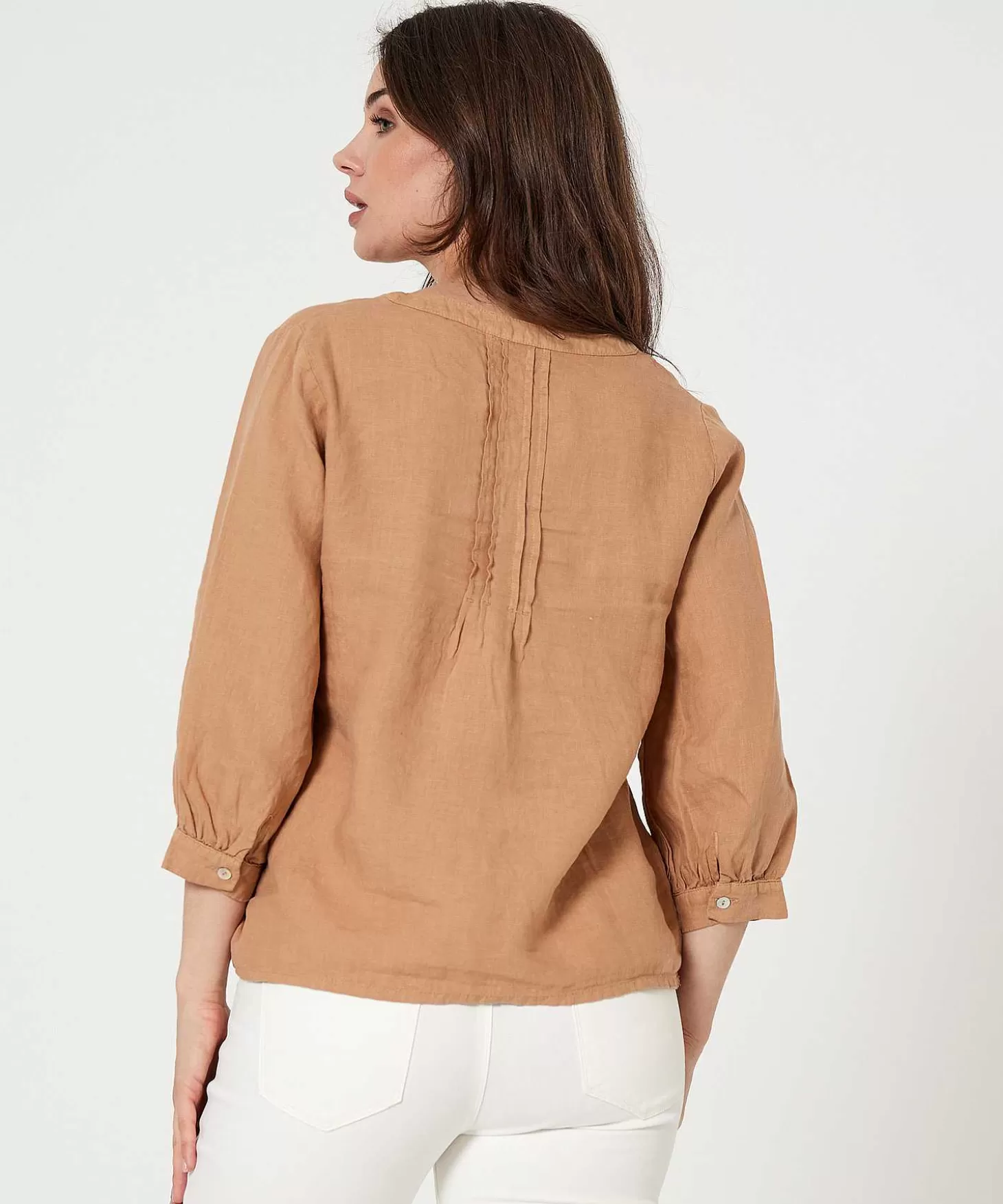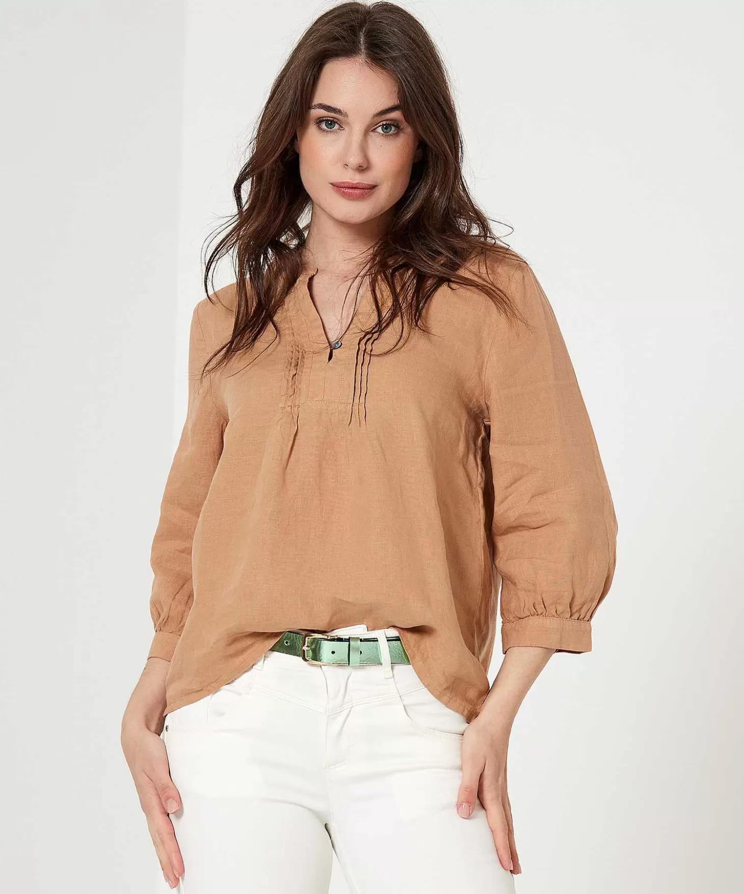 Linen For Life En Giulia E Tu Heeft Dat Goed Begrepen Met Deze Linnen Blouse. Wat Een Zomerzoete Kleurtjes (Wit, Kaneel En Roze) En Wat Een Relaxt Model Met Haar Tuniekhals + Knoopje, Rechte Fit En 3/4E Pof(Fende)Mouw. Naast Het Luchtige Comfort Van Linnen Heeft Ze Feminien Plooitjes Langs De Halslijn En Op De Rug. Je Draagt Haar Met Een Linnen Broek Of Rok + Loafers Voor Een Citychic Stijltje, Maar Ook Met Een (Capri)Jeans En Sneakers Ben Je Fashionable Onderweg. Samen Met Shorts En Sandaaltjes (En Een Rieten Zonnehoed) Ben Je Op Je Best Op Het Terras, Het Strand Of De Boulevard. Let The Sun Shine!. Samenstelling: 100% Linnen.