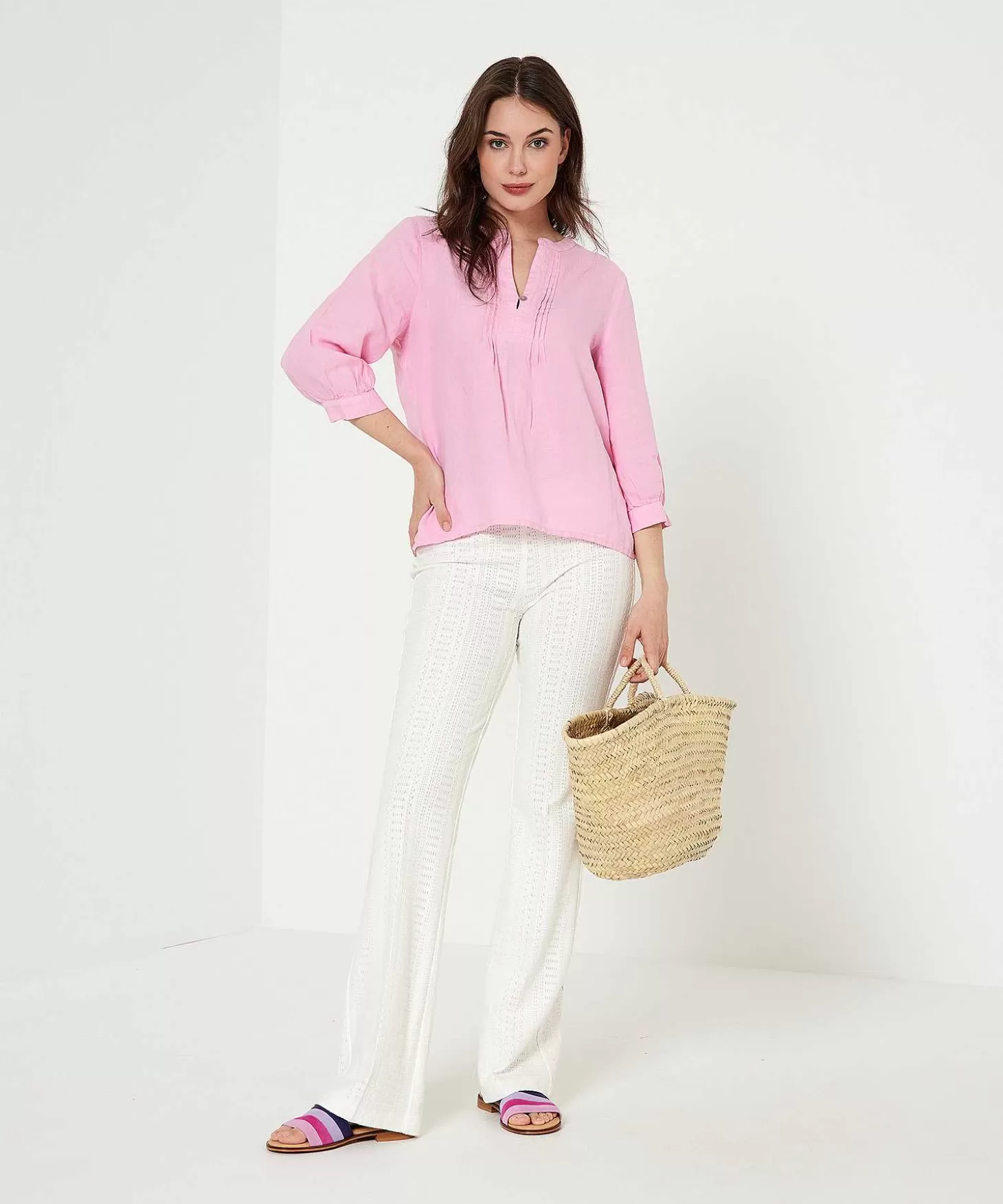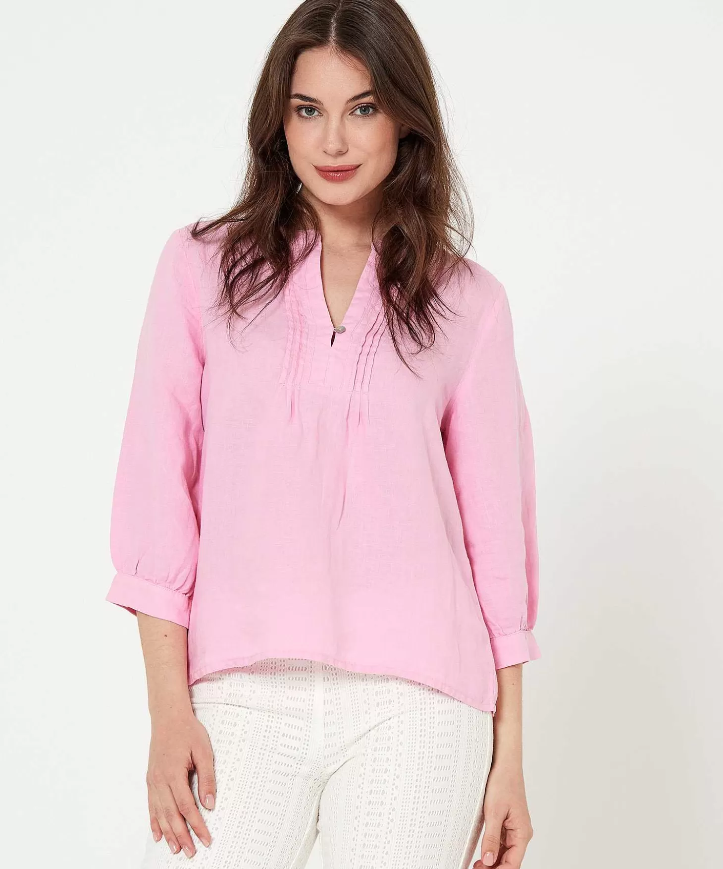 Linen For Life En Giulia E Tu Heeft Dat Goed Begrepen Met Deze Linnen Blouse. Wat Een Zomerzoete Kleurtjes (Wit, Kaneel En Roze) En Wat Een Relaxt Model Met Haar Tuniekhals + Knoopje, Rechte Fit En 3/4E Pof(Fende)Mouw. Naast Het Luchtige Comfort Van Linnen Heeft Ze Feminien Plooitjes Langs De Halslijn En Op De Rug. Je Draagt Haar Met Een Linnen Broek Of Rok + Loafers Voor Een Citychic Stijltje, Maar Ook Met Een (Capri)Jeans En Sneakers Ben Je Fashionable Onderweg. Samen Met Shorts En Sandaaltjes (En Een Rieten Zonnehoed) Ben Je Op Je Best Op Het Terras, Het Strand Of De Boulevard. Let The Sun Shine!. Samenstelling: 100% Linnen.