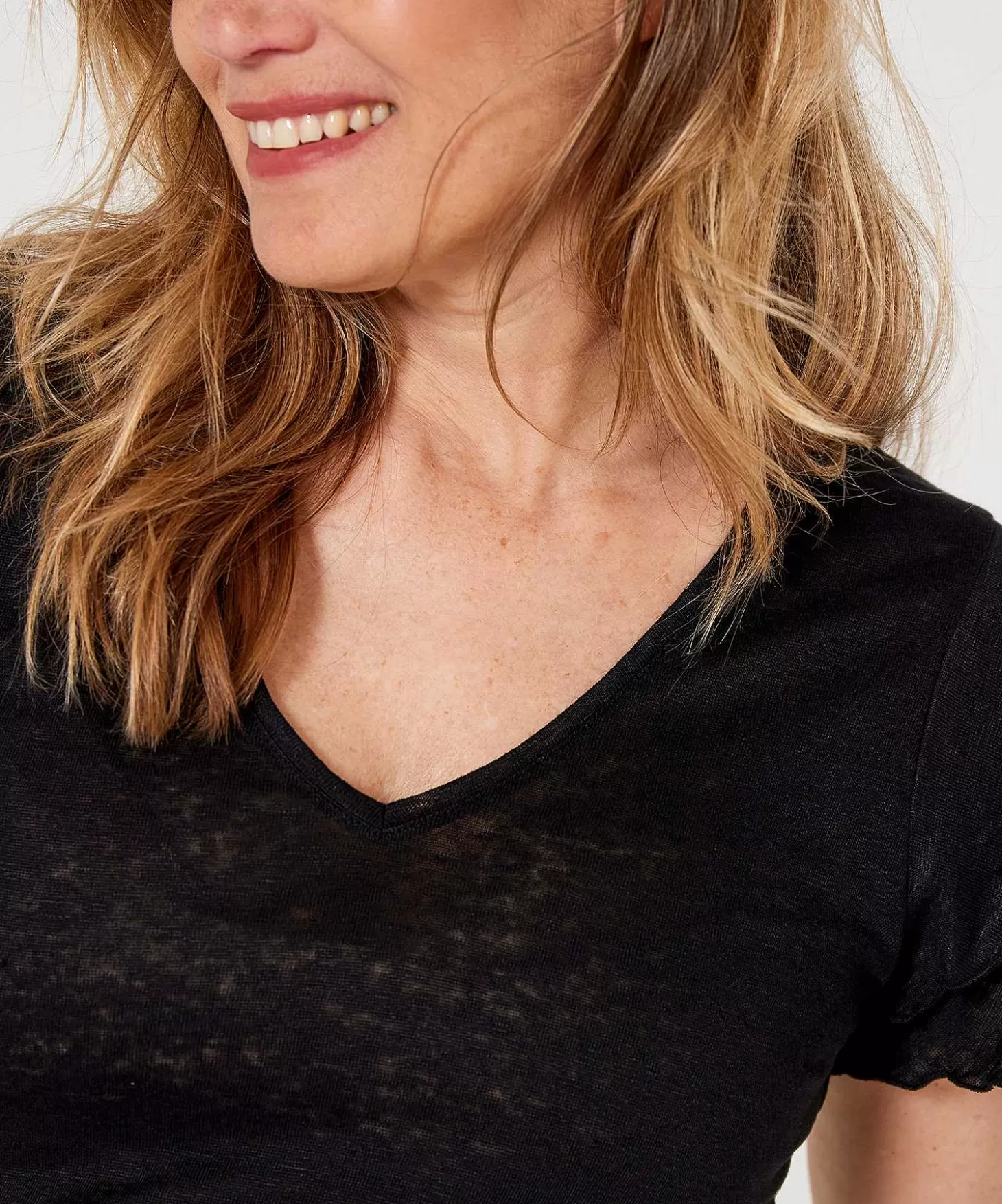 Double Fun Met Dit Linnen Giulia E Tu Shirt Met Dubbele Volants. Zie Je Haar Speelse Kapmouwtje, V-Hals En Relaxt Aange…
