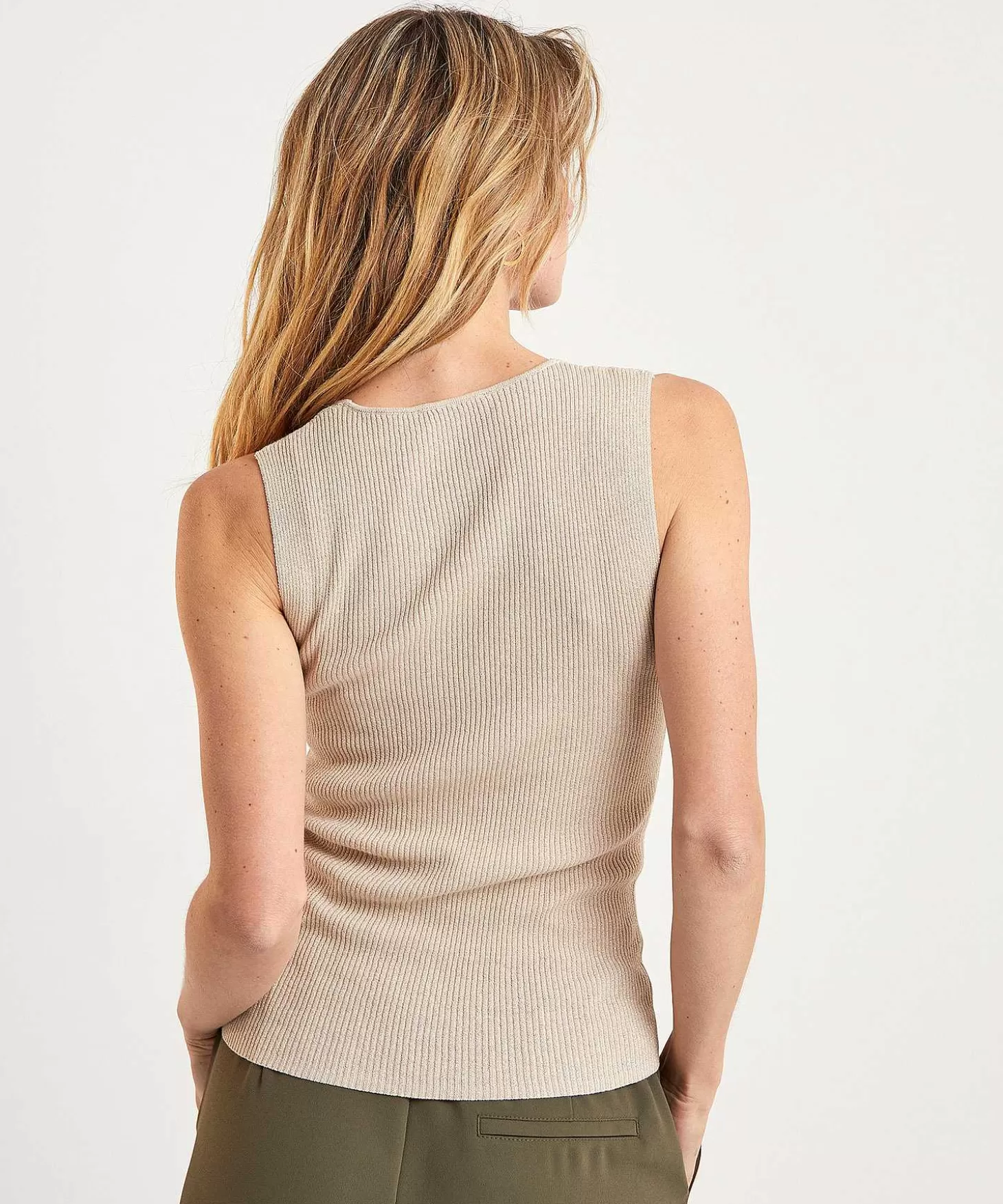 Dit Gebreide Giulia E Tu Truitje Combineert Lurex Met Een Fijn Ribbeltje. In Neutraal Zand Met Sparkling Lurex Past Dit Mouwloze Model Overal Onder En Boven. Ze Heeft Een V-Hals En Een Aansluitende Feminien Fit En Ze Past Bij Veel Uit Jouw Garderobe.