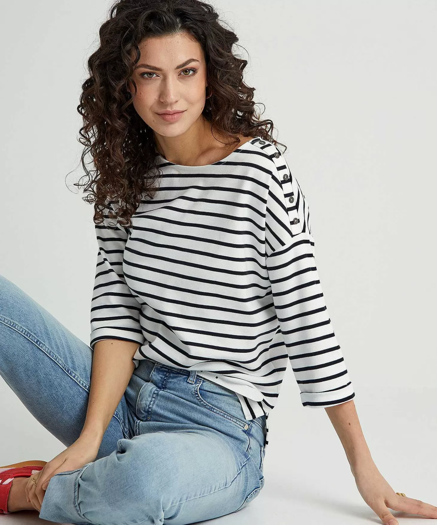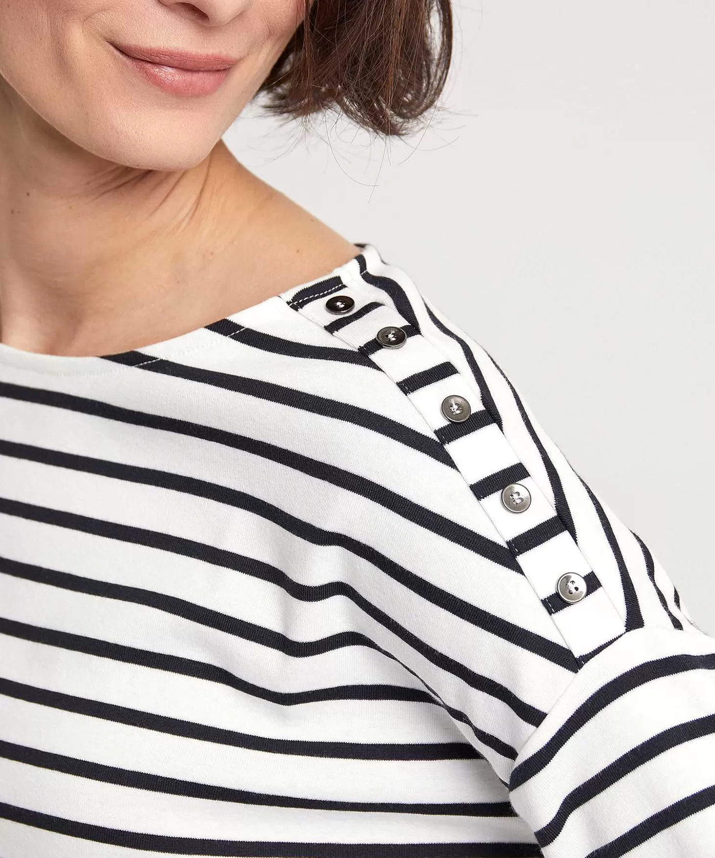 Dit Giulia E Tu Shirt Met Bretonse Streep Is Een Fashionable Blijvertje. Voel Je Haar Stevige Maar Soepele Witte Katoen Met Zwart, Groen Of Oceaanblauw Streepje En Zie Je Haar Wijde Hals, Fake Knoopsluiting En Laag Ingezette 3/4E Mouw Met Vaste Omslag? Dit Relaxte Model Heeft Splitjes Bij De Zoom En Een Verticale Bies Middenachter. Je Draagt Haar Met Een Jeans, Pantalon Of Wide Leg Broek, Maar Ook Een Denim Rok Kan Ze Prima Aan. Sneakers, Loafers Of Laarsjes Erbij En Je Ademt In Elke Outfit Maritieme Sferen. Samenstelling: 100% Katoen.