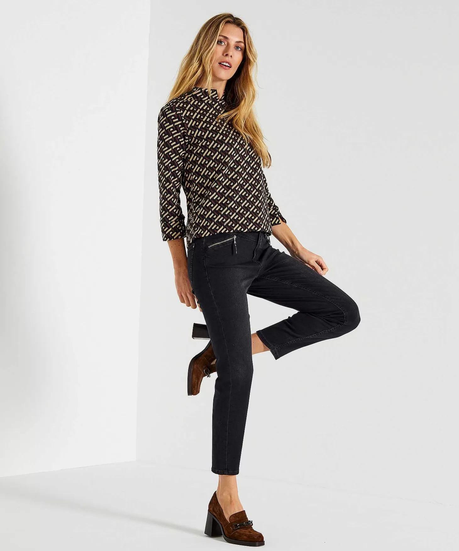Deel Van Een Co-Ord Set Is Deze Giulia E Tu Top In Jacquard Een Grafisch Plaatje. Wat Een Speels Retropatroon In Bruin, Beige En Zwart Dat Knipoogt Met Optische 3D Escher-Motieven. Deze Losse Maar Feminien Top Heeft Sportieve 3/4E Mouwen, Een Opstaand Boordje En Valt Net Voorbij De Taille. Stevig Gebreid In Jacquard Kwaliteit Is Ze Warm En Luchtig Tegelijk. Zie Je Haar Kniphals En Splitjes Bij De Manchet? Perfect Met De Giulia E Tu Flared Broek Grafisch Jacquard En Lak Instappers Zet Je Een Perfect Co-Ordinated Stijltje Neer. En Wat Dacht Je Van Samen Met Een Wide Leg Broek Of Jeans En Laarsjes En Accessoires In Een Pittige Trendkleur Zoals Oranjerood Of Groen? Wij Zijn Onder De Indruk, Jij Ook? Samenstelling: 52% Polyester, 47% Katoen, 1% Elastan.