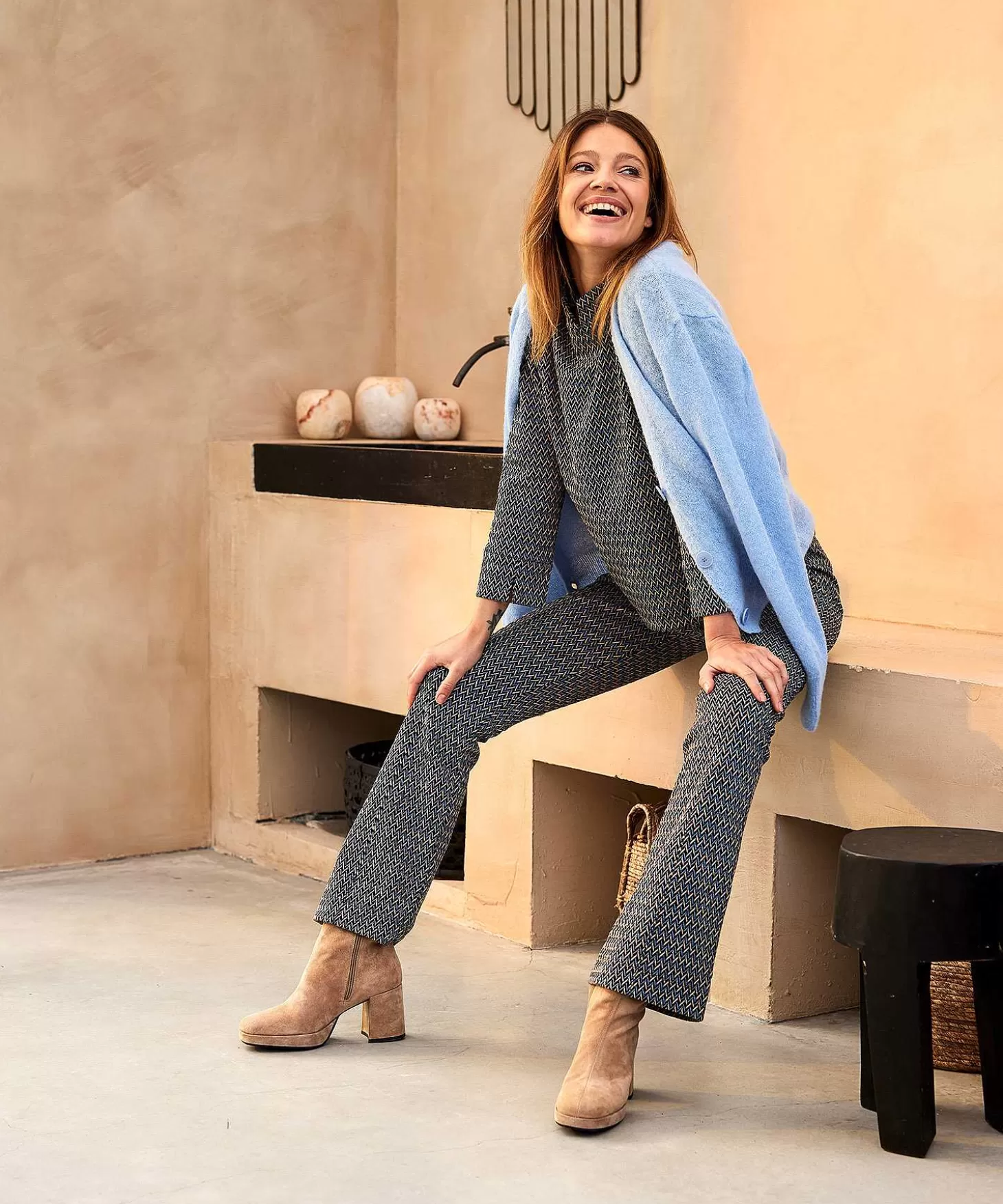 Deze Giulia E Tu Top Is Een Grafisch Hoogstandje. Wat Een Geweldig Visgraatmotief In Stevige Maar Zachte Jacquard. Retro Vibes All Over The Top In Zwart, Offwhite En Blauw. En Zie Je Haar Kniphals, 3/4E Mouw Met Split In De Brede Manchet En Korte Losse Fit? Draag Haar Als Trending Co-Ord Set Met De Giulia E Tu Flared Broek Visgraat Jacquard En Pittige Laarsjes Voor Een Classy & Sassy Office-, City Of Partylook. Maar Ook Met Een Glanstop + Wide Leg Broek Of Jeans En Laarsjes, Boots Of Lakloafers Ga Jij Fashionable Perfect Op Weg. Samenstelling: 48% Viscose, 46% Polyester, 6% Elastan.