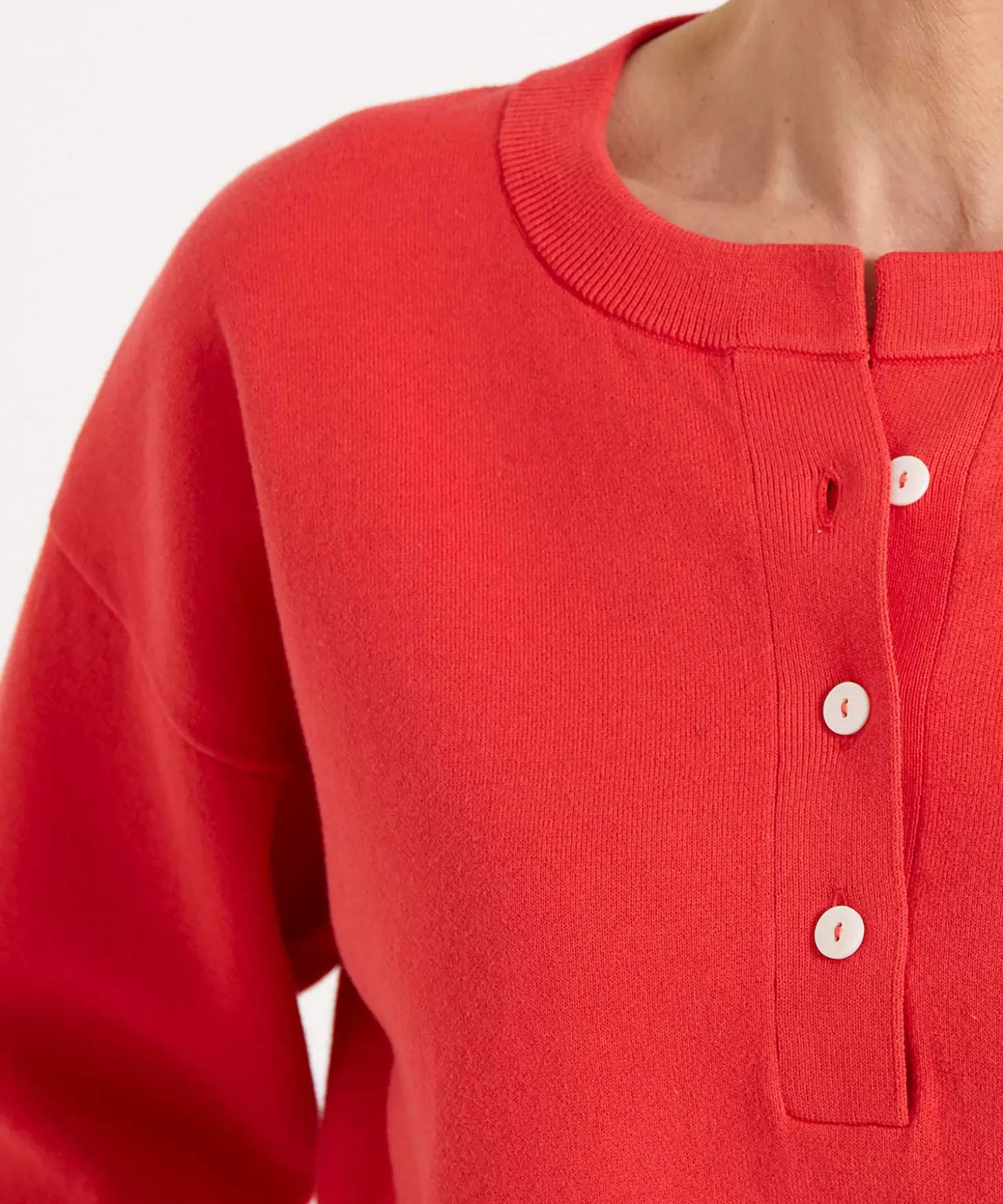 Deze Giulia E Tu Trui Heeft De Laatste Trends Goed In Haar Oren Geknoopt Met Haar Speelse Knoopsluiting. Knipogend Naar Het Granddad-Shirt Maar Dan In Warme Knit-Kwaliteit Met 3/4E Mouw En Een Boxy Model. Verkrijgbaar In Koraalrood En Donker Offwhite (Zand) Is Er Altijd Een Kleurtje Naar Jouw Smaak En Ze Past Bij Vele Stijlen. Draag Haar Met Een Maxi-Printrok En Laarsjes Op Boho Stedentrip, Maar Ook Met Een Pantalon + Loafers (Of High Heels) Ga Je Klassiek Sportief Naar Kantoor Of Een Feestje. En Wat Dacht Je Van Samen Met Een Jeans En Sneakers Tijdens Een Middagje Shoppen? Wij Zijn Om! Samenstelling: 90% Katoen, 9% Polyamide, 1% Elastan.