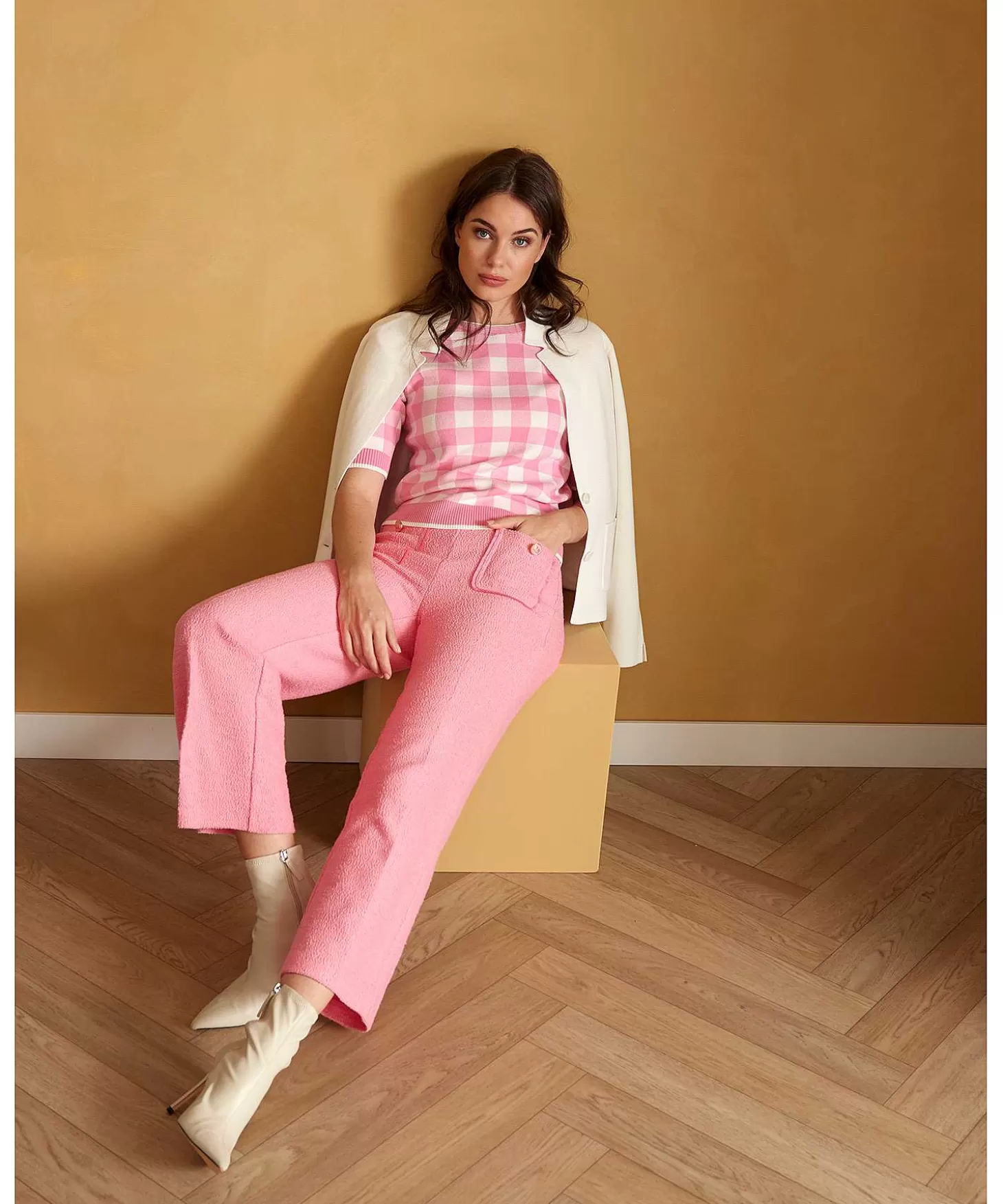 Dit Giulia E Tu Truitje Heeft Een Tijdloze Maxi-Ruit En Knipoogt Met Het Klassieke Bb-Ruitje. Wat Een Streelzacht Model In Katoenblend Met Haar Korte Aansluitende Mouw Met Lichte Pof En Aansluitende Maar Relaxte Fit. In Zand/Offwhite, Bubblegum Pink/Offwhite Of Denimblue/Offwhite Is Er Altijd Een Kleurtje Naar Jouw Modehart. Draag Haar Met Een Jeans En Sneakers Op Sportieve Citytrip Of Naar Kantoor Met Een Pantalon En Loafers Voor Een Preppy Look. Maar Ook Met Een Linnen Palazzo Of Maxi-Rok + Laarsjes Ben Je Klassiek Casual De Mooiste. Samenstelling: 80% Katoen, 17% Polyamide, 3% Elastan.