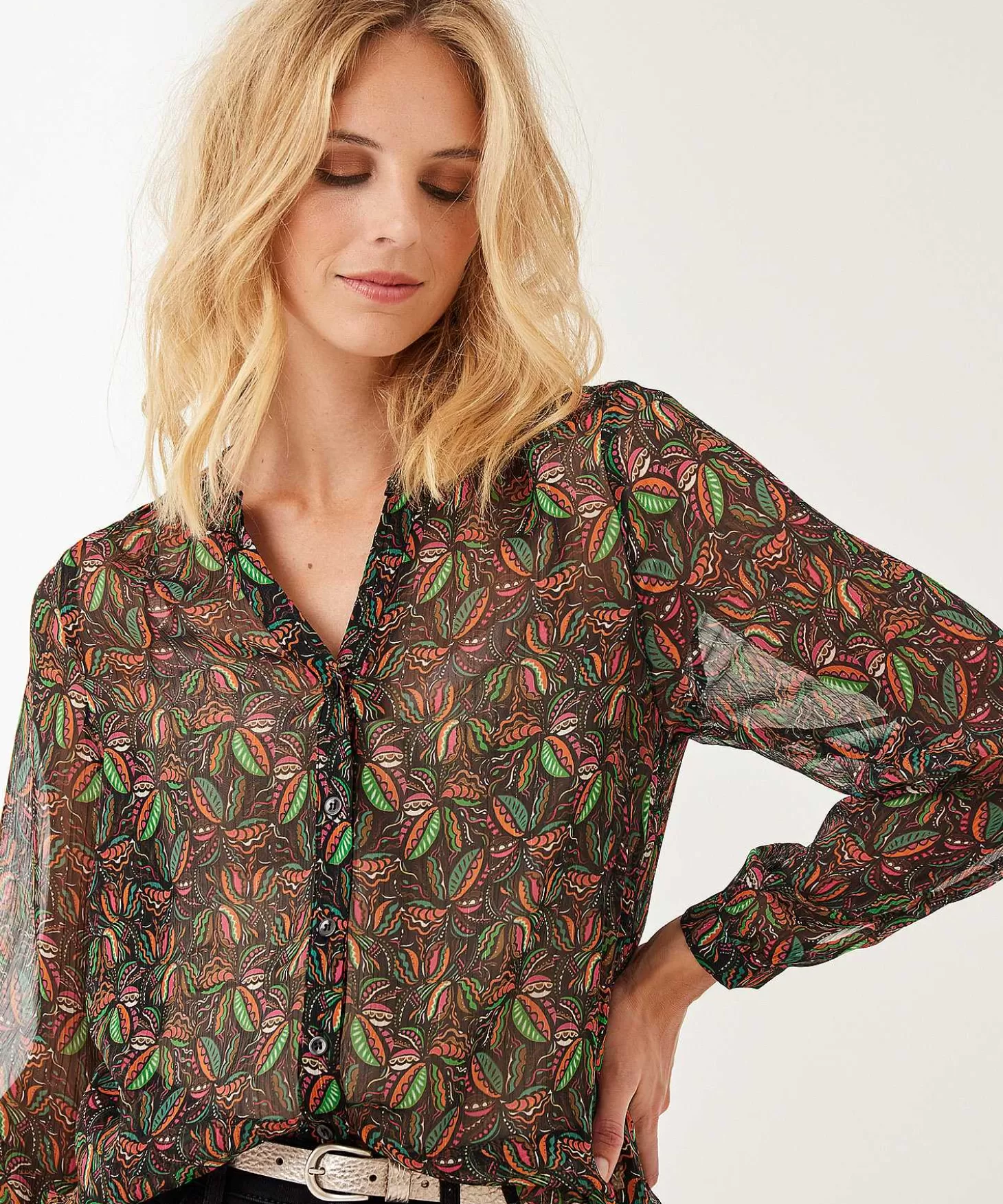 Zwierige Blouse Uit De Najaarscollectie Van Giulia E Tu. Wanneer De Dagen Korter Worden En De Kleuren Richting Herfst Gaan, Juist Dan Draag Je Graag Een Blouse Met Een Fijne ‘Fit’ En Een Vernieuwende Print. Deze Soepele Viscose Blouse Voldoet Aan Die Eisen. De Blouse Heeft Een V-Hals En Knoopsluiting. Het Recht Vallende Model, Waarbij Het Achterpand Wat Langer Is Dan Het Voorpand, Heeft Lange Mouwen Die Zijn Voorzien Van Smalle Boordjes. Beschikbaar In Een Bloemenprint In De Tinten Oranje, Fuchsia-Roze, Groen En Bruin Op Een Ondergrond Van Zwart En Als Extraatje Een Geweven Glanzend Lurex Draadje In Verschillende Tinten. En Er Is Een Variant In Een Luxe Panterprint Voorzien Van Een Geweven Goudkleurig Lurex Draadje. Combineer De Blouse Op Een Zwarte Jeans Of Bij Je Wide Leg Pants En Maak Af Met Een Warm Vest Of Een Blazer. Samenstelling: 99% Polyester, 1% Lurex.