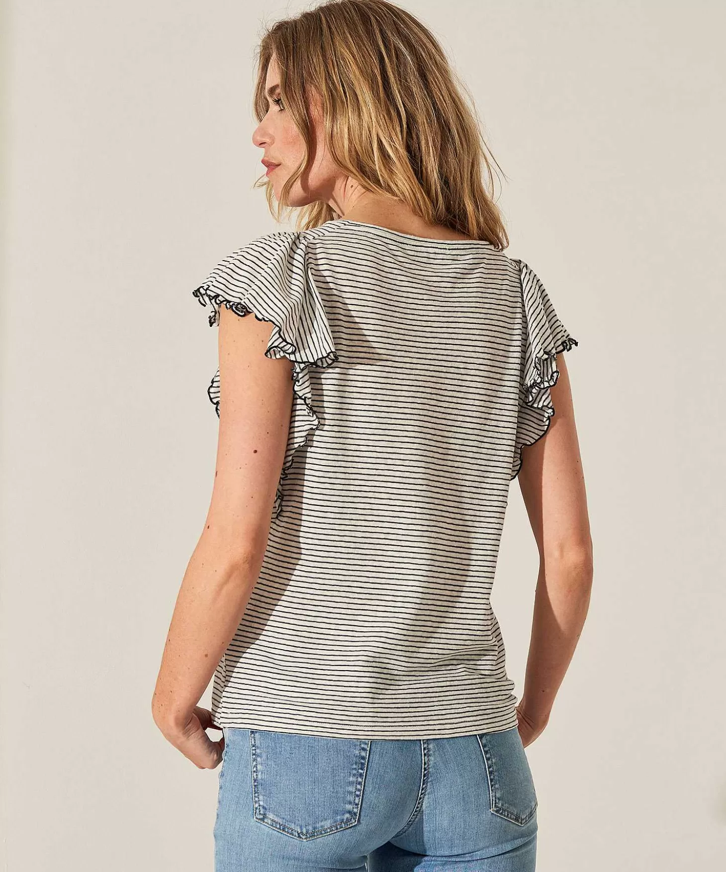 Ruffles & Stripes Met Dit Giulia E Tu Volant Shirt Met Fijn Streepje. Zie Je Haar Volants Mouwtje Dat In De Zijnaad Doo…