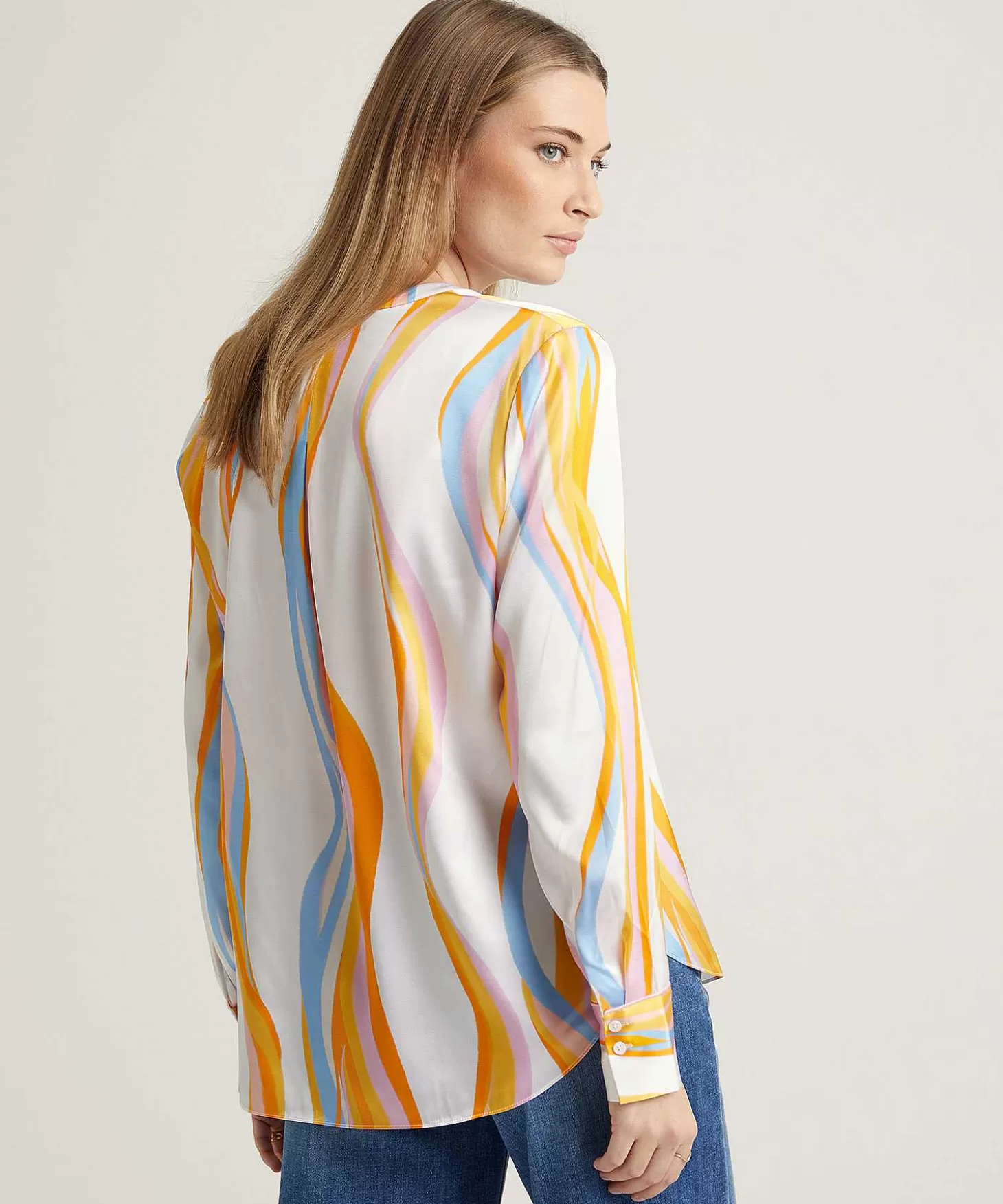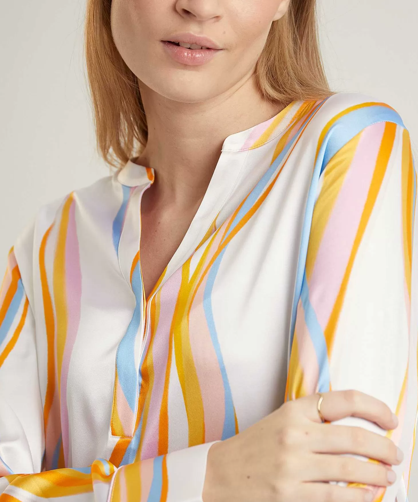 Een Zijden Blouse Van Herzen’S Angelegenheit Is Een Luxe Aanwinst Op Jouw Garderobe En Deze Met Flame Print Helemaal. In Een Flamboyant Vlampatroon In Donkergeel, Oranje, Roze En Lichtblauw Op Witte Zijde Is Dit Echt Een Plaatje. Zie Je De Minimalistische Tuniekhals Met Verborgen Knoopjes, Het Contrastbiesje Langs De Manchet En De Elegante Plooi In Het Achterpand En Voel Je De Luxe Zijde? Zijde Is Een Kostbaar Natuurlijk Materiaal Dat Niet Alleen Heerlijk Draagt (Ademend), Het Geeft Ook Een Chique Uitstraling. Je Combineert Deze Blouse Met Een Smalle Broek, Jeans Of Soepele Wide Leg Broek En Je Bent Altijd Perfect Gekleed. Samenstelling: 95% Zijde, 5% Elastan.