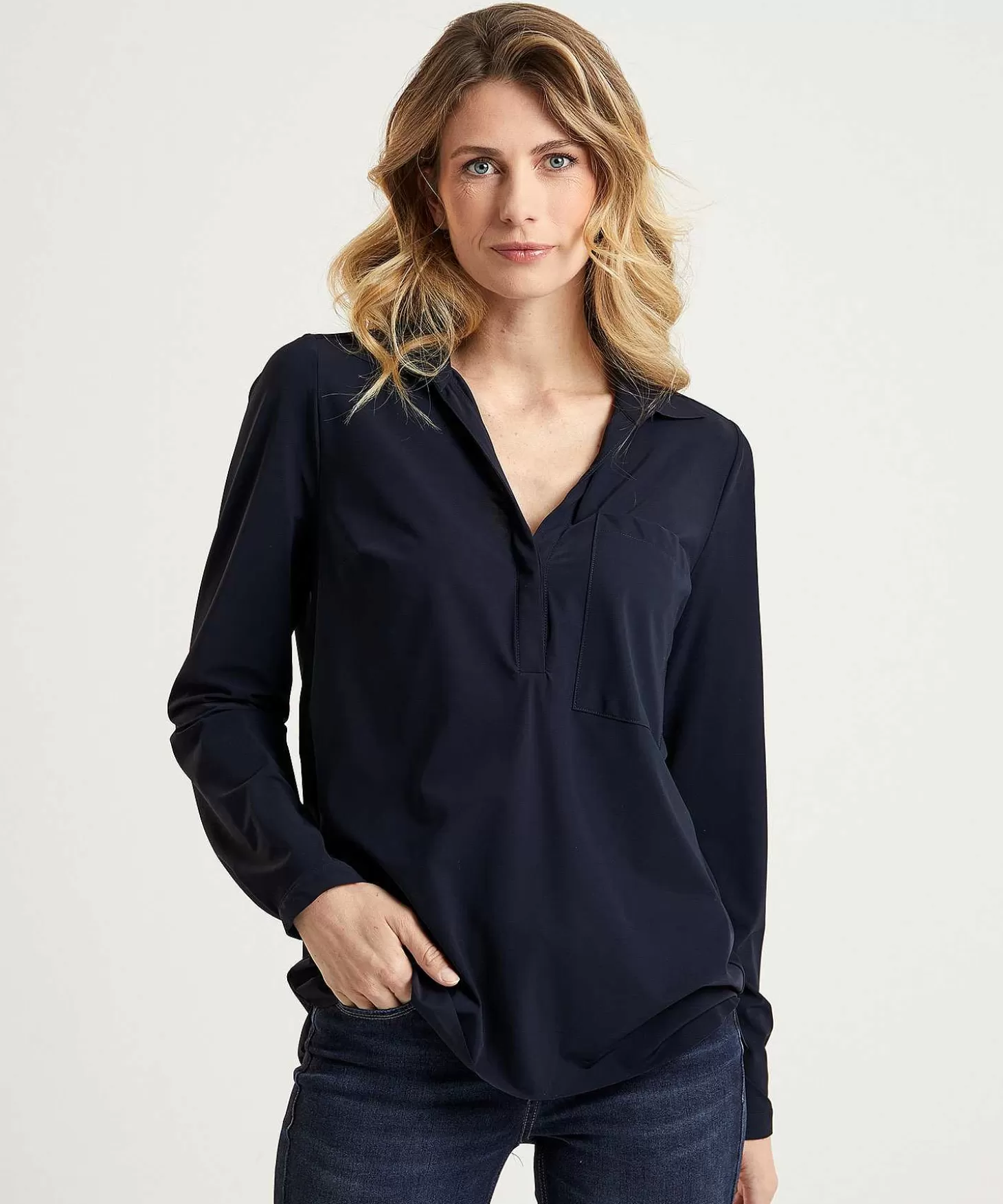 Tune Up Your Outfit! Deze Blouse Van Japan Tky Heeft Het Beste Uit Twee Werelden: De Looks Van Een Blouse En Het Comfort Van Travelwear. Sneldrogend En Kreukvrij En Er Nog Steeds Effortlessly Cool & Sophisticated Uitzien. Met Haar Iets Langere Tuniek Model, Blinde Knoopsluiting, Royale Borstzak En Eenvoudig Gesneden Ronde Zoom (Achter Langer Dan Voor), Draag Je Haar Perfect Met Een Jeans Of Slank Gesneden Pantalon. Van Dit Travelmaatje Ga Jij Veel Plezier Hebben: Van Sportieve Bezigheden Tot Op Een Party. Samen Kunnen Jullie Alles Aan! Verkrijgbaar In Wit, Nachtblauw En Zwart. Samenstelling: 73% Polyamide, 27% Elastan.