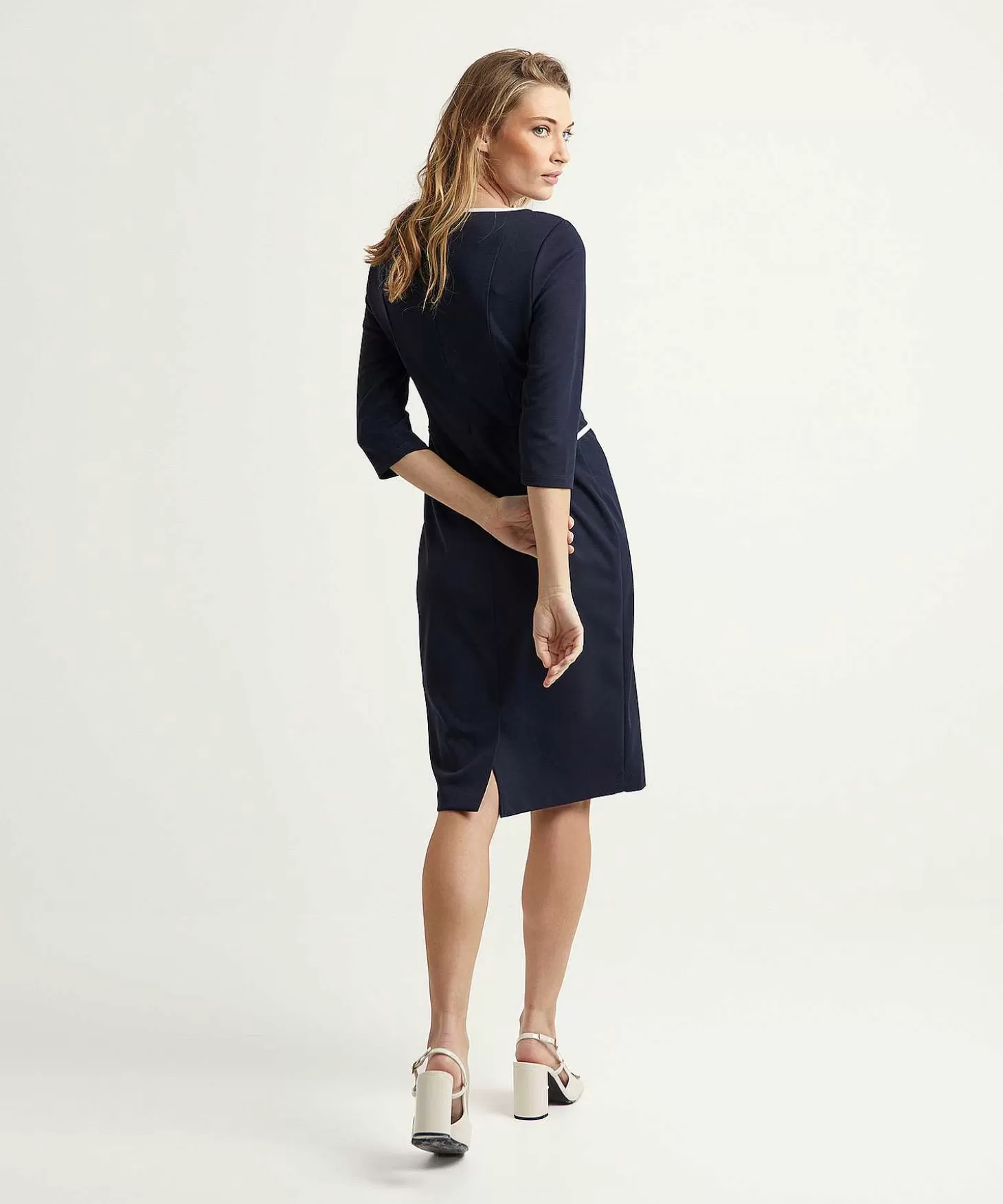Strik Je Taille Met Deze Joseph Ribkoff Jurk Met Contrasterende Biesjes. Wat Een Tijdloze Beauty Met Haar Klassieke Nachtblauw/Offwhite Kleurpalet En Kokerjurk-Model. Zie Je Haar Elegante Boothals, Strikdetail, 3/4E Mouw En Verborgen Rits + Loopsplit Achter? Met Haar Lengte Rond De Knie En Feminien Pasvorm Laat Je Alle Hoofden Draaien. Draag Deze Lievelingsjurk Met Preppy Loafers, Pittige High Heels Of Stoere Laarsjes Overal Naar Toe Waar Klasse Een Vereiste Is. Samenstelling: 95% Polyester, 5% Spandex. Voering: 100% Polyester.