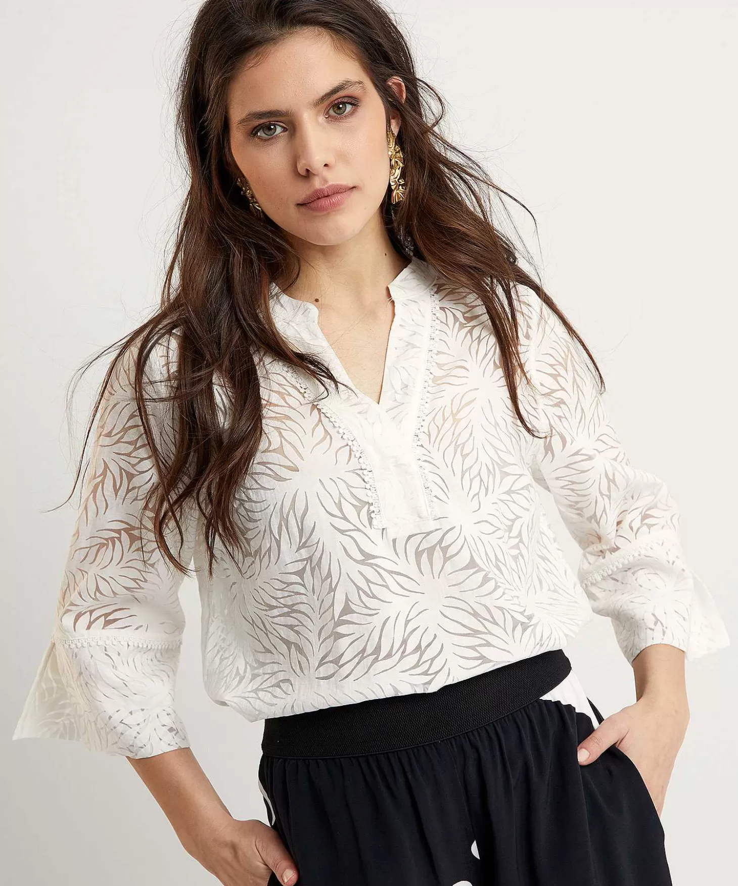 Luchtige Ausbrenner Blouse Olga Met Kielsluiting Van Kyra, In Offwhite Of ‘Blue Galaxy’ Blauw. De Doorkijkjes Tussen De Over All Bladprint Maken Deze Blouse Tot Een Echte Center Piece. De Halflange Mouwen Met Split Zijn, Net Als De Hals, Afgewerkt Met Een Kantrandje. Deze Rechte Blouse Draag Je Over Een Bijpassende Kyra Top, Of Eentje In Huidkleur.. Ze Combineert Sportief Op Een Witte Broek Of Jeans, Maar Is Ook Een Stralende Blikvanger Op Een Feestje! Samenstelling: 81% Viscose, 19% Polyamide.