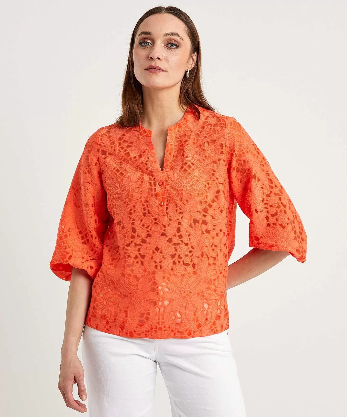 Warm Zonnig Oranje Gecombineerd Met Een Geweven Bloemenprint En Transparante Delen. Blouse Tamara Uit De Collectie Van …