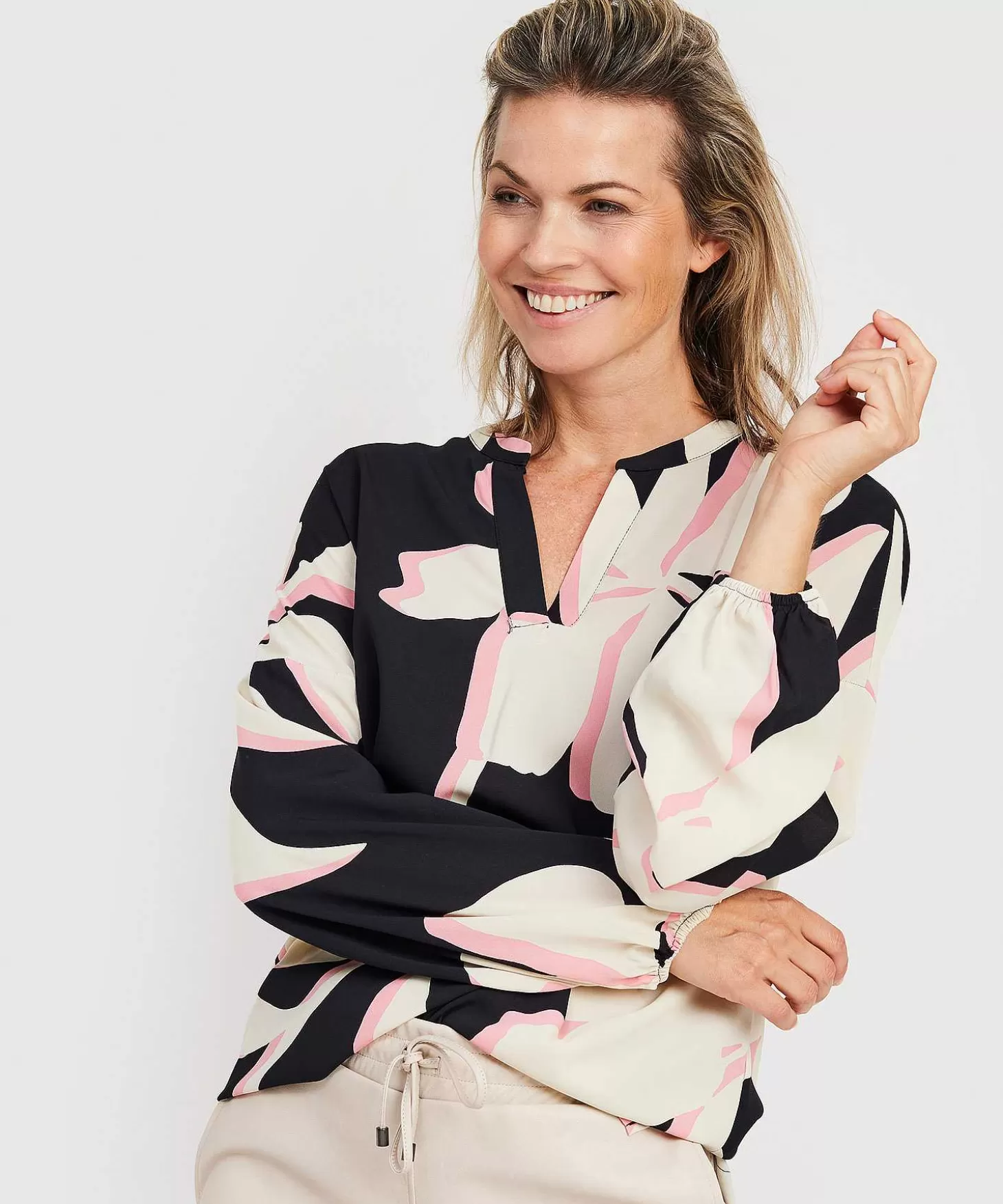 Add Some Flower Power To Your Wardrobe Met Deze Ravissante Kyra Blouse In Bloemprint. Wat Een Feestelijke Musthave In Offwhite, Roze En Zwart En Wat Een Comfortabel Zwierig Stofje. Naast Haar Tuniek Halslijn Met Overslag Heeft Ze Een Laag Ingezette Mouw Die Taps Toe Loopt Naar De Manchet, Een Brede Boord En Een Losse Pasvorm. Je Draagt Deze Top Met En Zwarte Pantalon En Instappers Of High Heels Naar Kantoor Of Een Feestje. Maar Ook Met Een Jersey Broek En Sneakers Ga Jij Sporty & Classy Op Citytrip. Flowers Are Always A Sassy Choice En Tova Springt Met Liefde In Jouw Garderobe. Samenstelling: 95% Viscose, 5% Elastan.