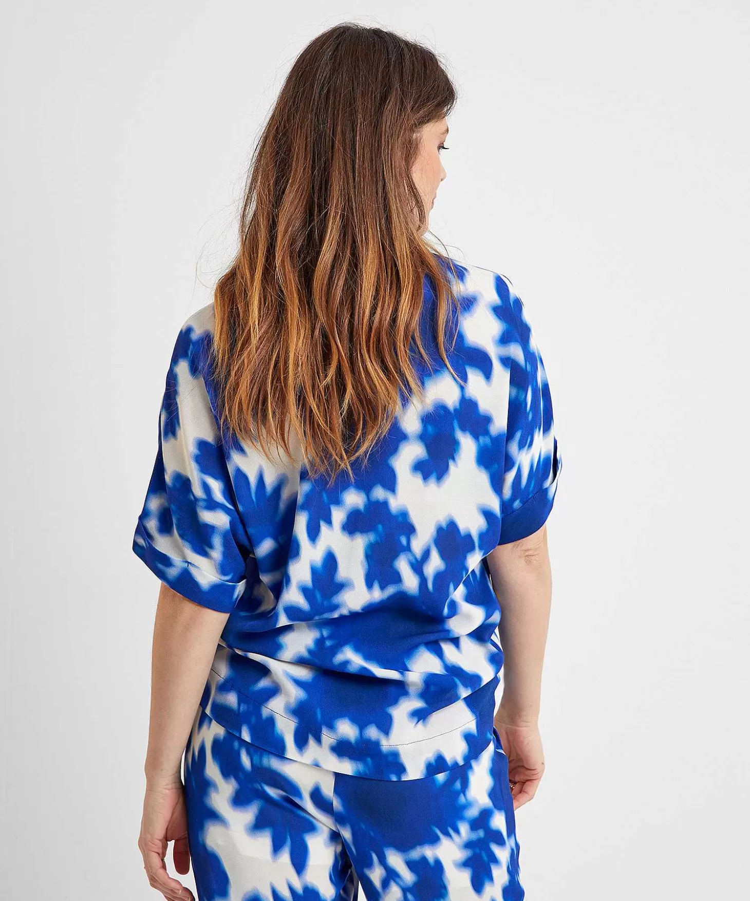 Kyra Top Model Karen In Luchtige Viscose. Het Fijne Van Viscose Is Dat De Kleuren Niet Vervagen En Dat Wil Je Ook Absoluut Niet Met Deze Bloemenprint In Sprankelende Delftsblauwe Tinten Op Een Roomwitte Ondergrond! Deze Recht- En Losvallende Blouse/Top Heeft Een Mooie Halsafwerking Met V-Lijn En Aangeknipte Korte Mouwen Met Omslag. Combineer Haar Als Pak Met De Bijpassende Rechte Broek (Prachtig Voor Een Feest!) Of Maak Er Een Casual Look Van Met Jeans Of Denim Rok. Met Bijpassend Blauwe Vestje Luna Van Kyra Erover Is Je Nieuwe Top Ready To Wear! Samenstelling: 100% Viscose.
