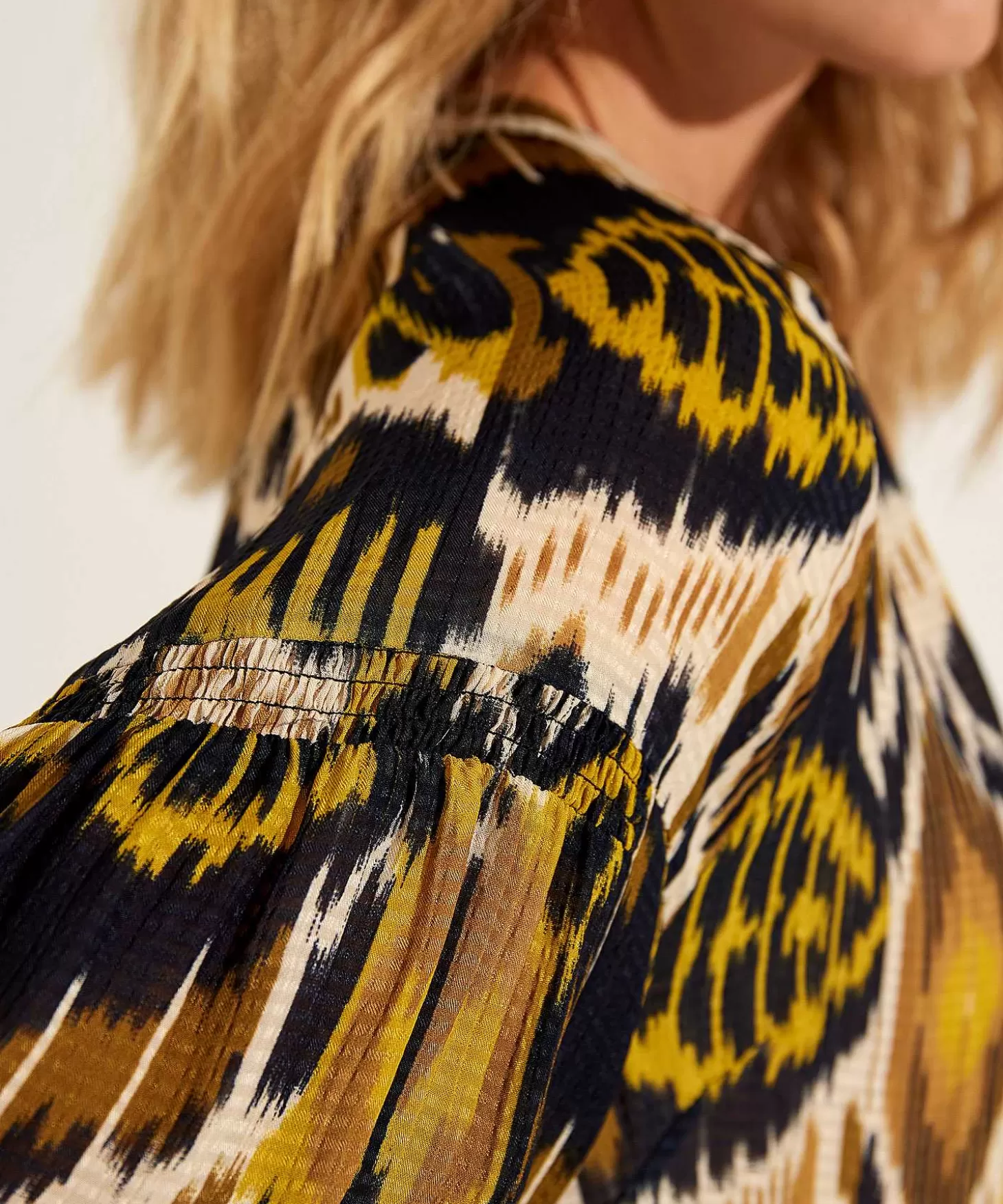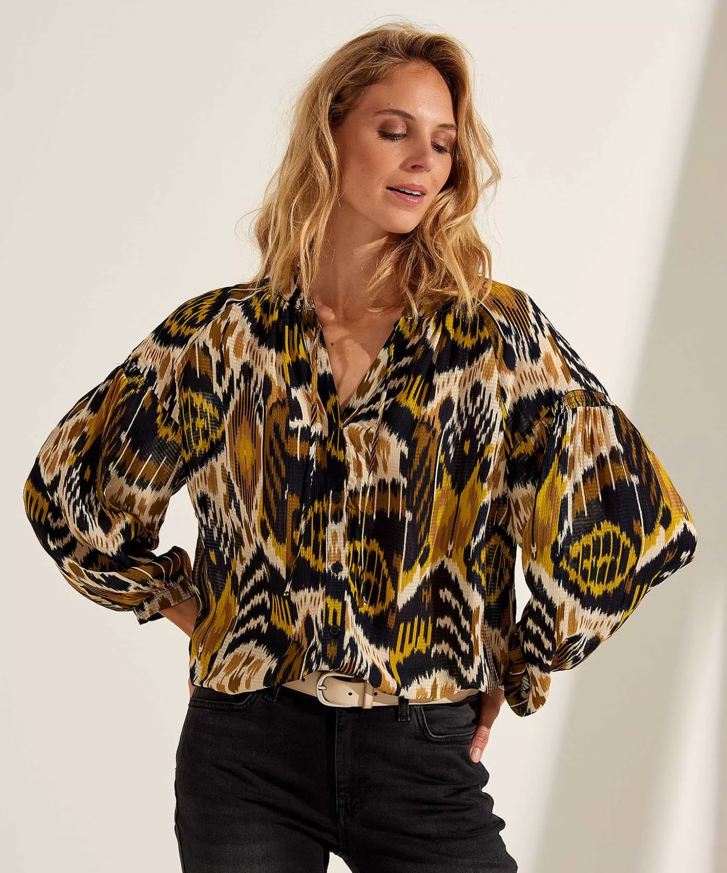 Het Prachtige Ikatmotief In Een Combinatie Van Mosterdgeel, Curry, Camel Zacht Beige En Diep Donkerblauw Maken Deze Blouse ‘Vaiana’ Uit De Collectie Van Kyra Een Echt Eyecatcher. Met Een Knipoog Naar Bohemian Chic Draag Je Deze Blouse Bijvoorbeeld Op Rok Vanessa In Dezelfde Print. De Geweven Stof Is Soepel En Valt Losjes. De Blouse Heeft Een Ronde Hals Met Koordjes En Een Lage Mouwinzet Met Ballonmouwen Afgewerkt Met Een Klein Manchetje. Trek De Mouw Op Tot Net Onder Je Elleboog Voor Een Speels Effect.