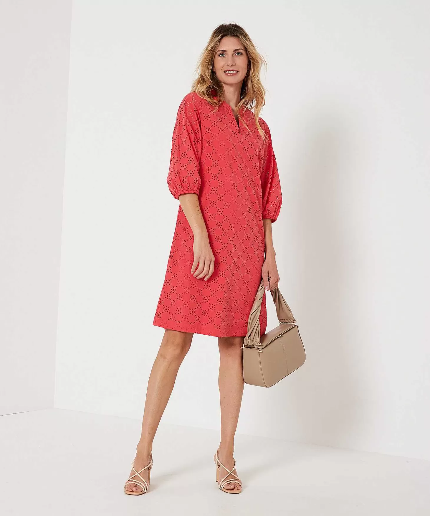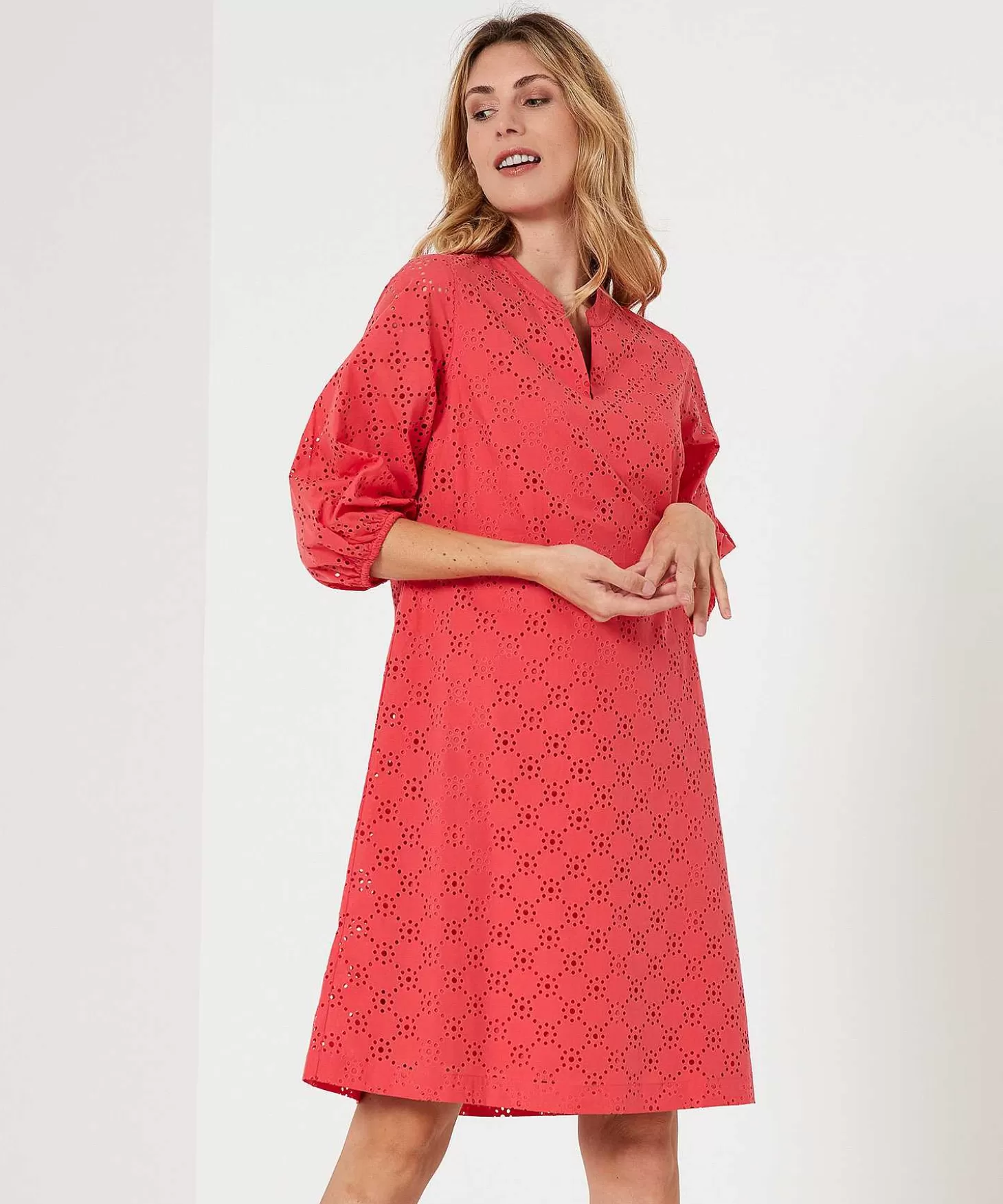 Broderie Meets Pointillism Met Deze Kyra Jurk In Stippel Broderie. Zie Je Haar Zomerse Koraalkleur En Broderie Patroon …