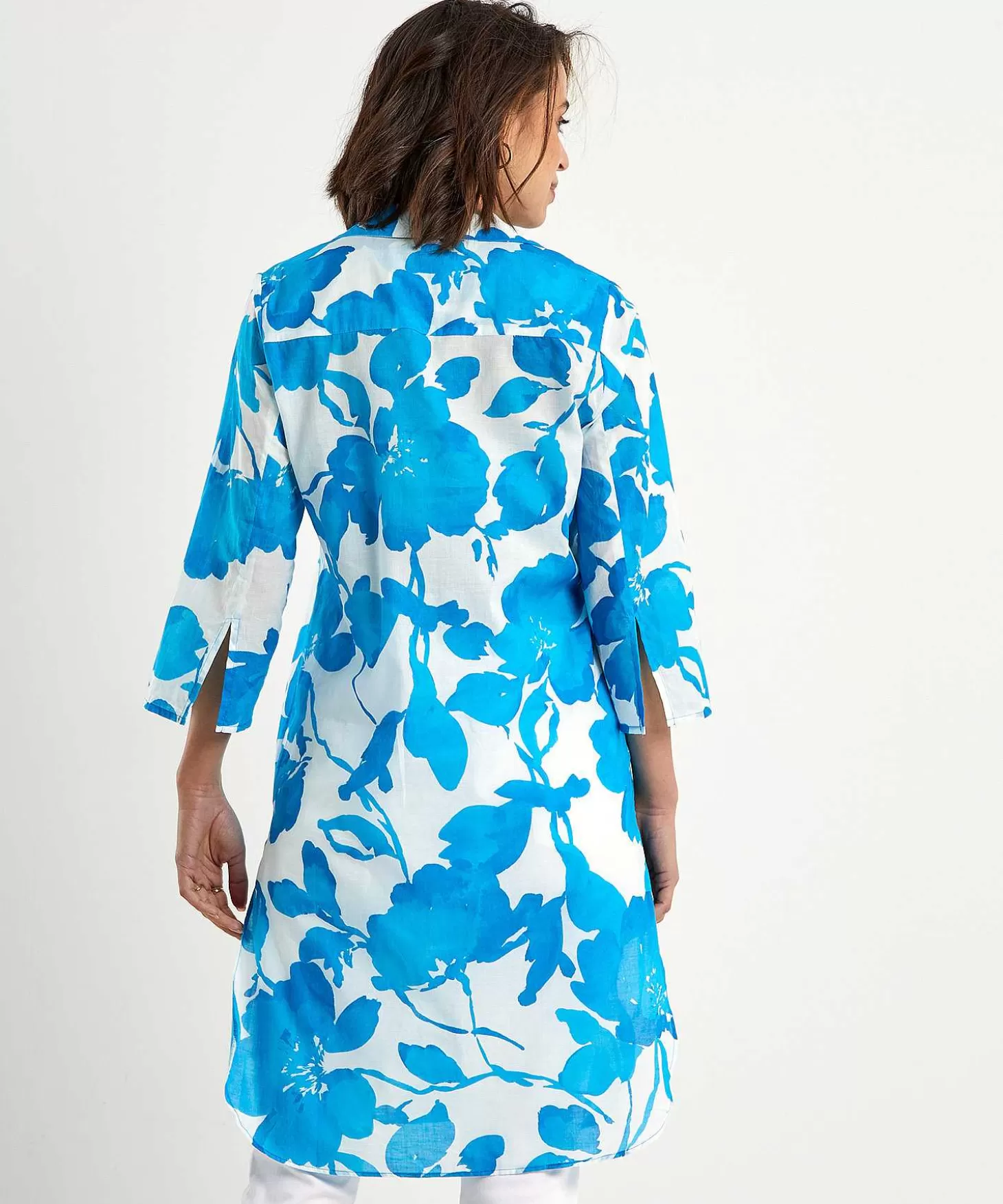 Kyra Blousejurk Bonnie Combineert Cotton Voile Met Tropische Bloemen. In Luchtige Semitransparante Witte Katoen Met Turquoise Bloempatroon Is Dit De Perfecte Zomerjurk. Naast Een Kraagje, 3/4E Mouwen En Een Ronde Zoom Met Zijsplit, Sluit Ze Met Knoopjes. Bonnie Is Perfect Voor Op Het Strand En Naar Een Feestje Of Het Terras.
