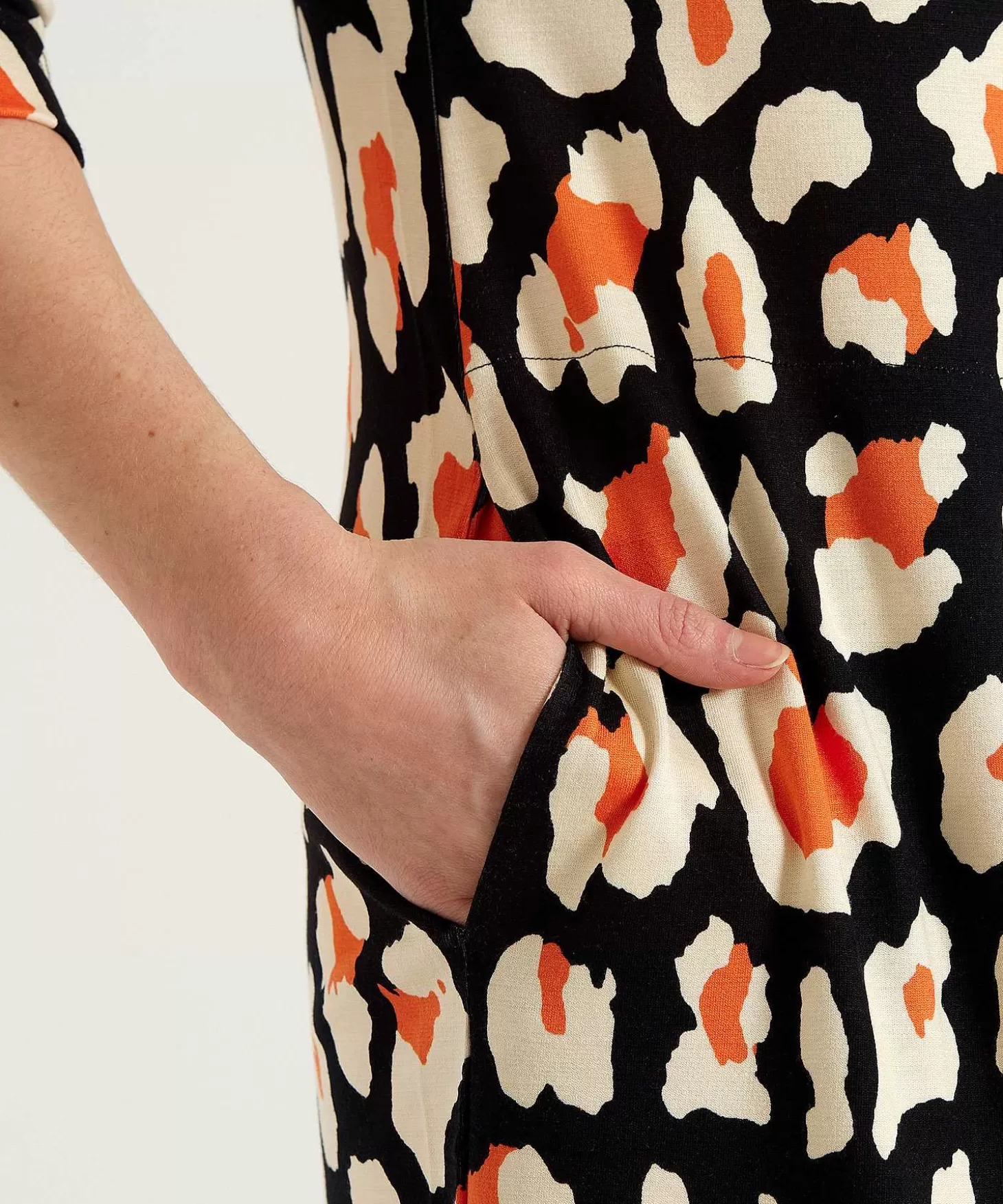Animalistic & Simplistic Is Deze Kyra Jurk In Animalprint Er Eentje Naar Jouw Hart. Wat Een Relaxt Model In Oranje En Offwhite Vlekjes Op Een Zwarte Basis En Zie Je Haar Creatieve Details? Het Dubbele Kraagje (Puntkraag + V-Hals), De 3/4E Ballonmouw Met Brede Manchet En De Praktische (Buidel!)Zakken, Zodat Je Jezelf Een Hand Kunt Geven. En Dan Haar Zachte Maar Stevige Jersey En Relaxte Fit – In Lilja Beweeg Je Je Comfortabel Én Opvallend. Je Draagt Haar Met Hoge Laarzen, Instappers, High Heels Of Sneakers En Combineert Haar Met Uni Accessoires Voor Een Persoonlijke Stijl. Dit Model Valt Over De Knie En Met Een Strikceintuur Creëer Je Alsnog Een Gewenste Taille, Maar Als Haar Mooie Zelf Is Ze Sowieso ‘Spot On’. Samenstelling: 80% Viscose, 15% Polyester, 5% Elastan.